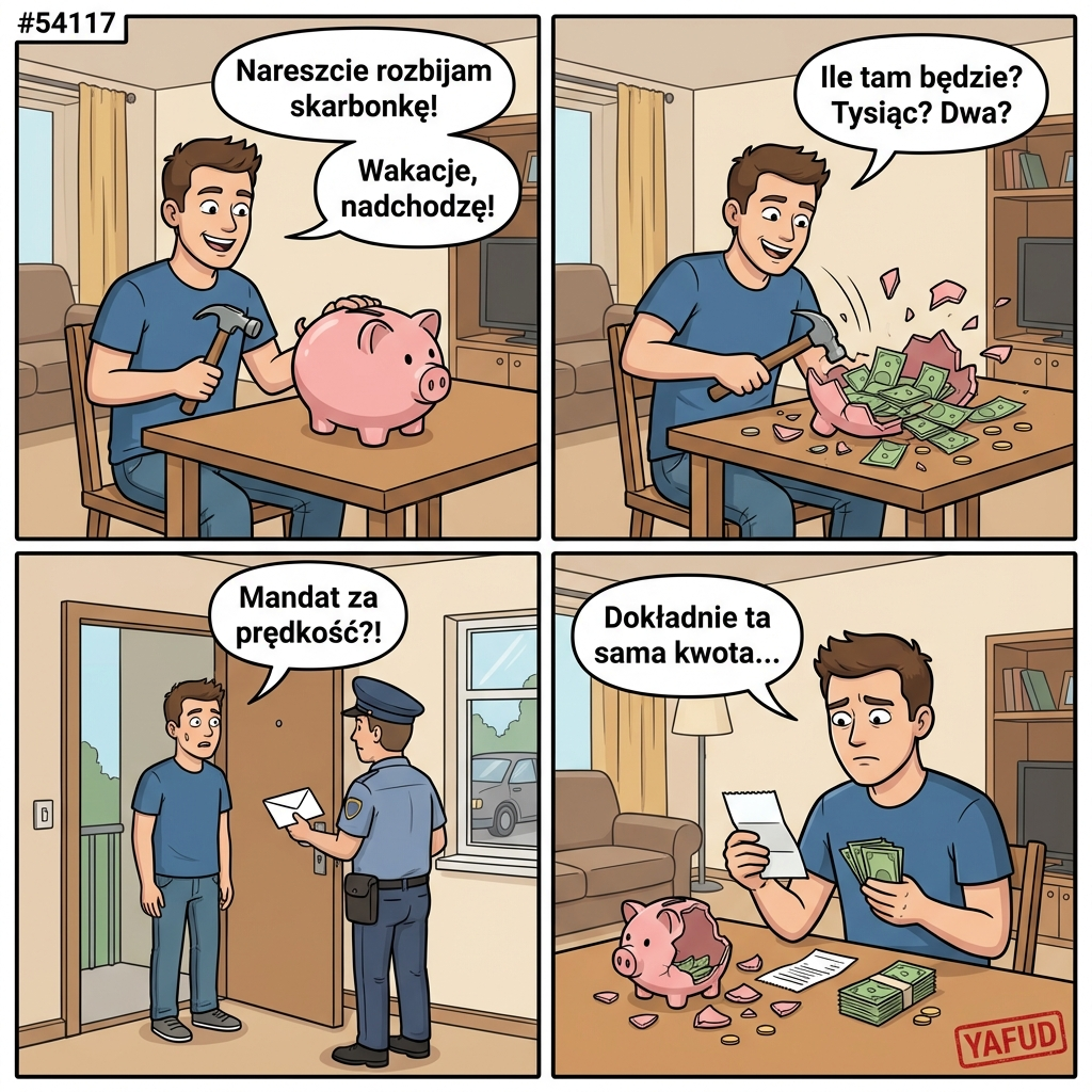Odkładałem pieniądze na wakacje do skarbonki. Kiedy ją rozbiłem, okazało się, że uzbierałem kwotę idealnie pasującą na pokrycie mandatu za przekroczenie prędkości, który dostałem tego samego dnia. YAFUD«Poprzednia wpadkaNastępna wpadka »
