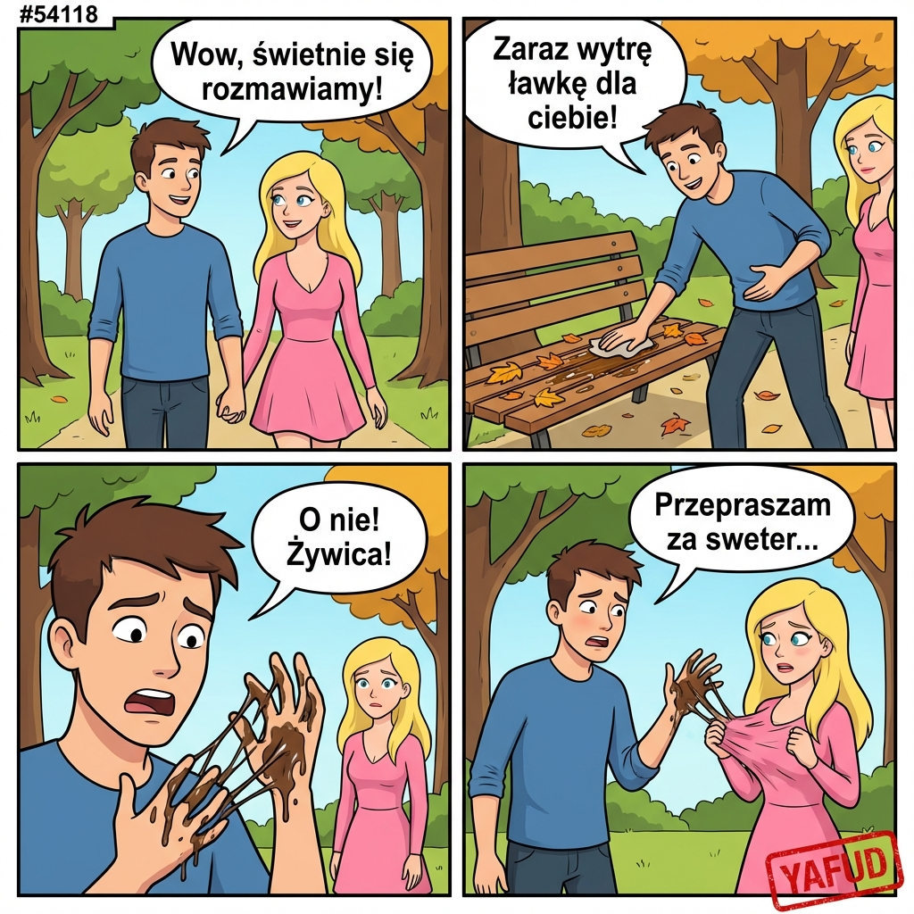 Umówiłem się na randkę z dziewczyną, która bardzo mi się podobała od kilku miesięcy. Poszliśmy na spacer do parku, rozmowa kleiła się idealnie. W pewnym momencie chciałem usiąść na ławce i szarmancko przetarłem ją ręką z liści. Nie zauważyłem, że pod liśćmi była świeża, lepka żywica, w którą wsadziłem całą dłoń. Resztę randki spędziłem z ręką, która kleiła się do wszystkiego, łącznie z jej swetrem przy pożegnaniu. YAFUD«Poprzednia wpadkaNastępna wpadka »