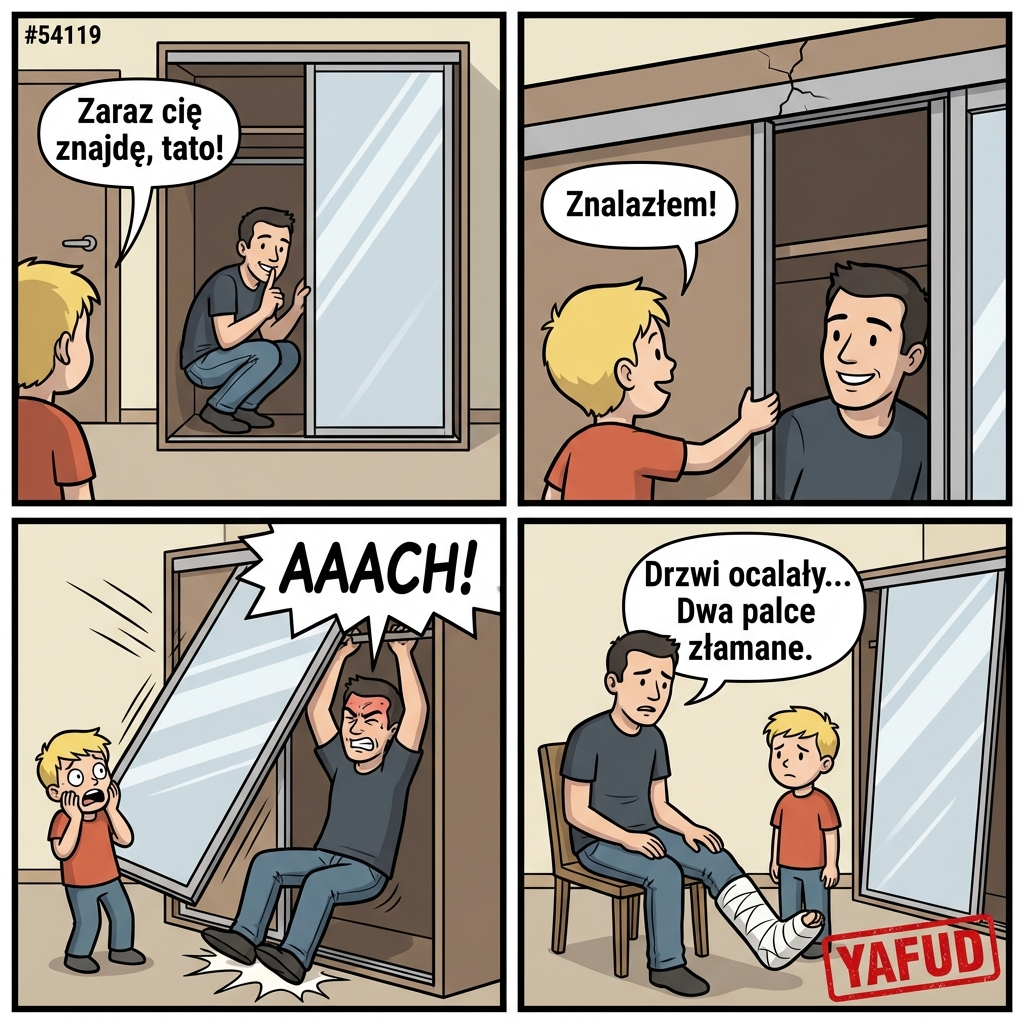 Bawiłem się z synem w chowanego. Schowałem się w szafie przesuwnej w przedpokoju. Kiedy syn mnie znalazł i otworzył drzwi, prowadnica górna pękła i ciężkie drzwi z lustrem wypadły z toru, lecąc prosto na mnie. Złapałem je w ostatniej chwili, ale przygniotły mi palce u stóp. Drzwi ocalały, ale mam dwa złamane palce i gips na nodze przez głupią zabawę. YAFUD«Poprzednia wpadka