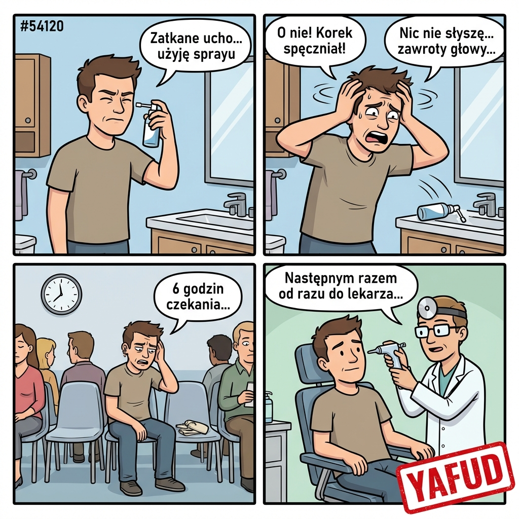 Miałem zatkane ucho, więc użyłem specjalnego sprayu do czyszczenia. Niestety, zamiast rozpuścić woskowinę, preparat spowodował, że korek spęczniał i całkowicie zablokował kanał słuchowy. Straciłem słuch w jednym uchu całkowicie i dostałem zawrotów głowy. Musiałem iść na płukanie ucha do laryngologa, który przyjął mnie dopiero po 6 godzinach czekania. YAFUD«Poprzednia wpadkaNastępna wpadka »