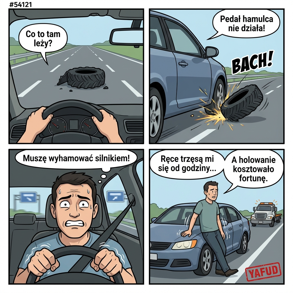 Jadąc autostradą, najechałem na leżący na jezdni kawałek opony z ciężarówki. Odbił się on tak niefortunnie, że uderzył w podwozie i zerwał przewód hamulcowy. Pedał hamulca wpadł w podłogę. Na szczęście udało mi się wyhamować silnikiem i zjechać na pas awaryjny, ale stres był taki, że trzęsły mi się ręce przez godzinę. Holowanie kosztowało fortunę. YAFUD«Poprzednia wpadkaNastępna wpadka »