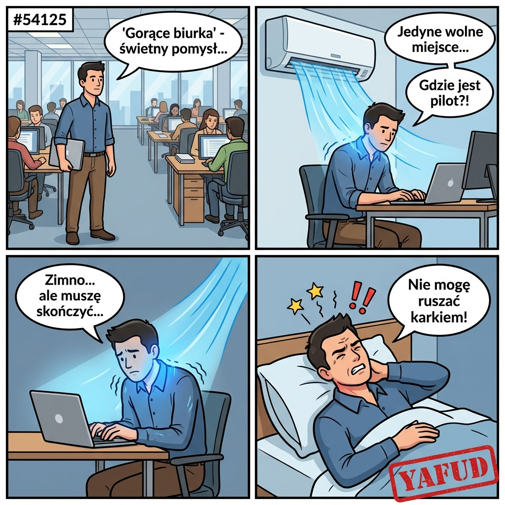 Moja firma postanowiła wprowadzić system 'gorących biurek', gdzie nikt nie ma swojego stałego miejsca. Przyszedłem do pracy trochę później i zostało tylko jedno wolne biurko. Było to miejsce tuż pod klimatyzatorem, który wiał lodowatym powietrzem prosto w kark, a pilot do niego zaginął. Następnego dnia obudziłem się ze sztywnym karkiem i nie mogłem ruszać głową. YAFUD«Poprzednia wpadka
