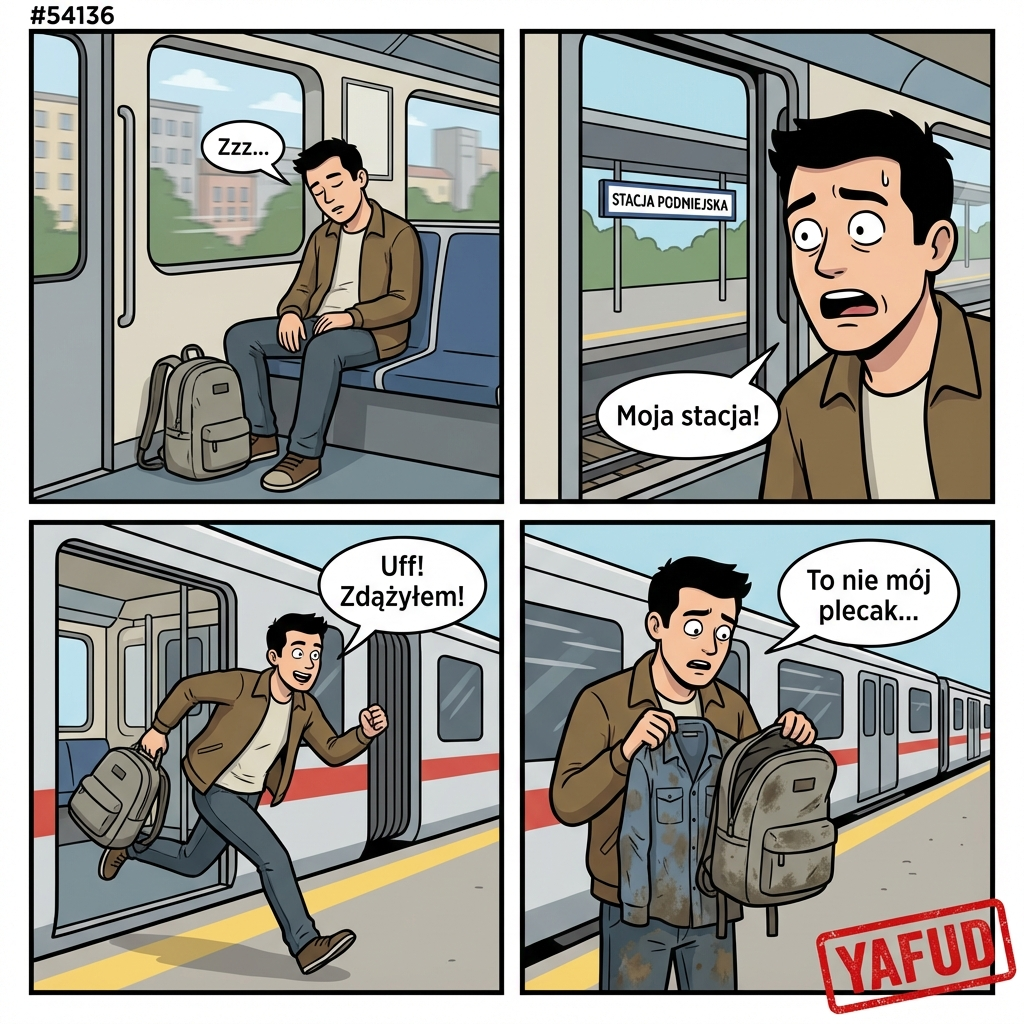 Zasnąłem w pociągu podmiejskim. Obudziłem się na mojej stacji w ostatniej chwili. Zerwałem się, chwyciłem plecak i wybiegłem na peron. Drzwi się zamknęły, pociąg ruszył, a ja zorientowałem się, że w pośpiechu chwyciłem plecak innej osoby, który wyglądał identycznie jak mój. W środku były tylko brudne ubrania robocze. YAFUD«Poprzednia wpadka