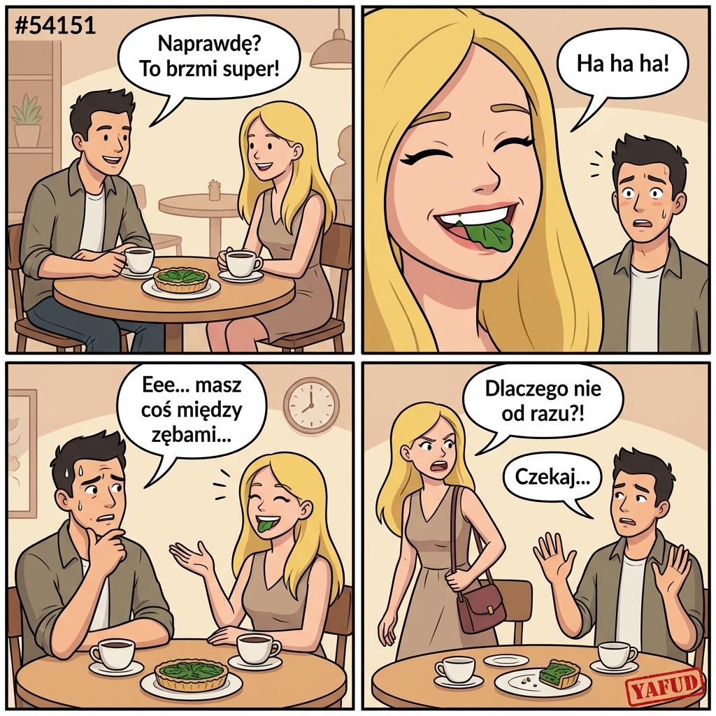 Umówiłem się na randkę z dziewczyną z Tindera w kawiarni. Rozmowa kleiła się świetnie, dopóki nie uśmiechnęła się szeroko. Miała między jedynkami wielki kawałek szpinaku z tarty, którą jadła. Przez 20 minut biłem się z myślami, czy jej powiedzieć. W końcu powiedziałem. Obraziła się, że nie zrobiłem tego od razu i wyszła. YAFUD«Poprzednia wpadkaNastępna wpadka »