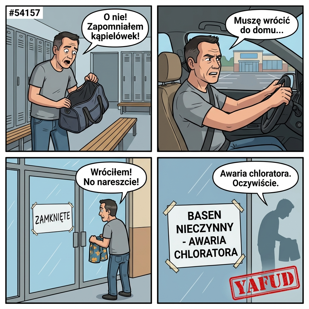 Poszedłem na basen po raz pierwszy od lat. W szatni zorientowałem się, że zapomniałem kąpielówek. Pojechałem do domu po nie, wróciłem, a basen był zamknięty z powodu awarii chloratora. YAFUD«Poprzednia wpadkaNastępna wpadka »