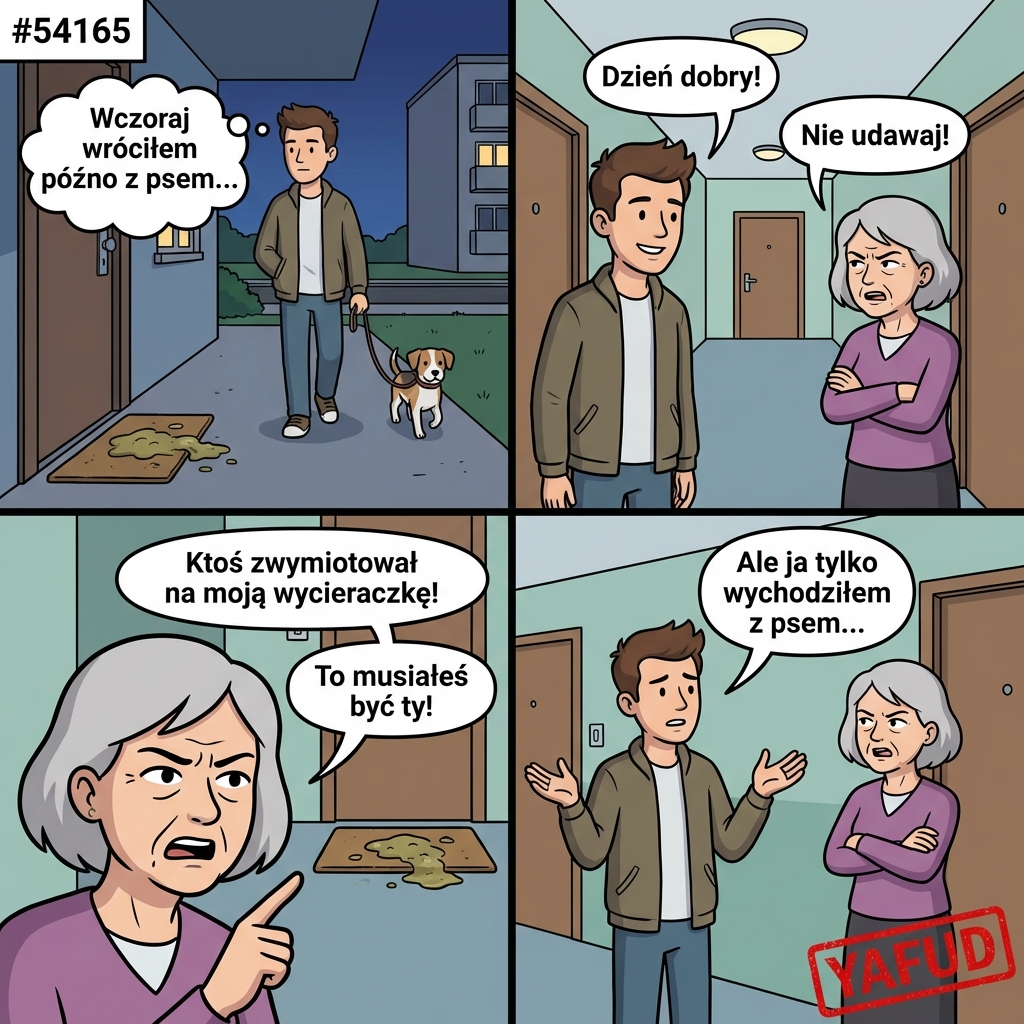 Wychodziłem rano do pracy i spotkałem sąsiadkę. Powiedziałem grzecznie 'Dzień dobry', a ona spojrzała na mnie z obrzydzeniem i powiedziała 'Nie udawaj'. Okazało się, że ktoś w nocy zwymiotował jej na wycieraczkę, a ona jest święcie przekonana, że to byłem ja, bo widziała mnie wracającego późno z psem. YAFUD«Poprzednia wpadkaNastępna wpadka »