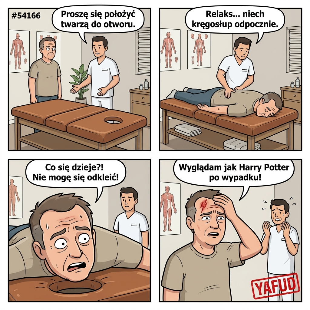 Poszedłem na masaż leczniczy kręgosłupa. Masażysta kazał mi się położyć na stole z otworem na twarz. Po sesji chciałem wstać, ale okazało się, że skóra na czole przykleiła się do skórzanego obicia stołu. Wstałem zbyt gwałtownie i zdarłem sobie naskórek na środku czoła. Wyglądam jak Harry Potter po wypadku. YAFUD«Poprzednia wpadkaNastępna wpadka »