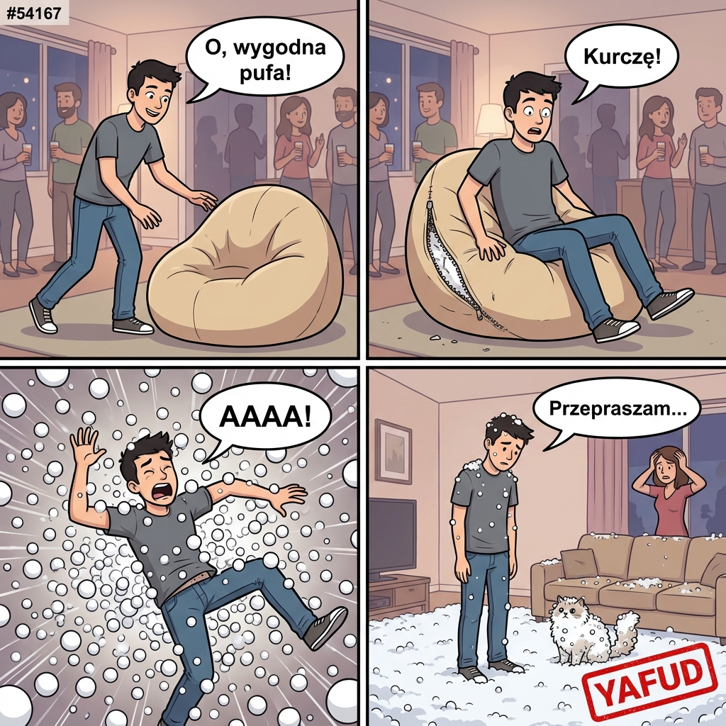 Byłem na domówce u znajomych. Usiadłem na pufie, która okazała się być pufą wypełnioną styropianowym granulatem, ale z niedopiętym zamkiem. Pod moim ciężarem pufa pękła, a miliony kulek styropianu rozsypały się po całym mieszkaniu, elektryzując się i przyklejając do wszystkiego, łącznie z kotem gospodarzy. YAFUD«Poprzednia wpadka