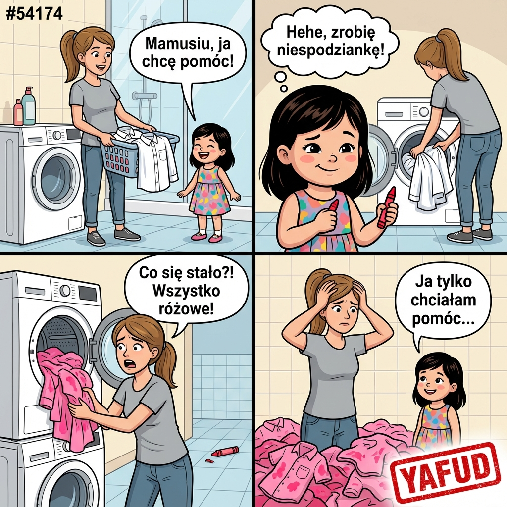 Moja 3-letnia córka chciała mi pomóc w praniu. Kiedy nie patrzyłam, wrzuciła do bębna z moimi białymi koszulami czerwoną kredkę świecową. Pranie się zrobiło, suszarka wysuszyła, a ja mam teraz całą garderobę w różowe, woskowe plamy, których nie da się niczym usunąć. YAFUD«Poprzednia wpadkaNastępna wpadka »