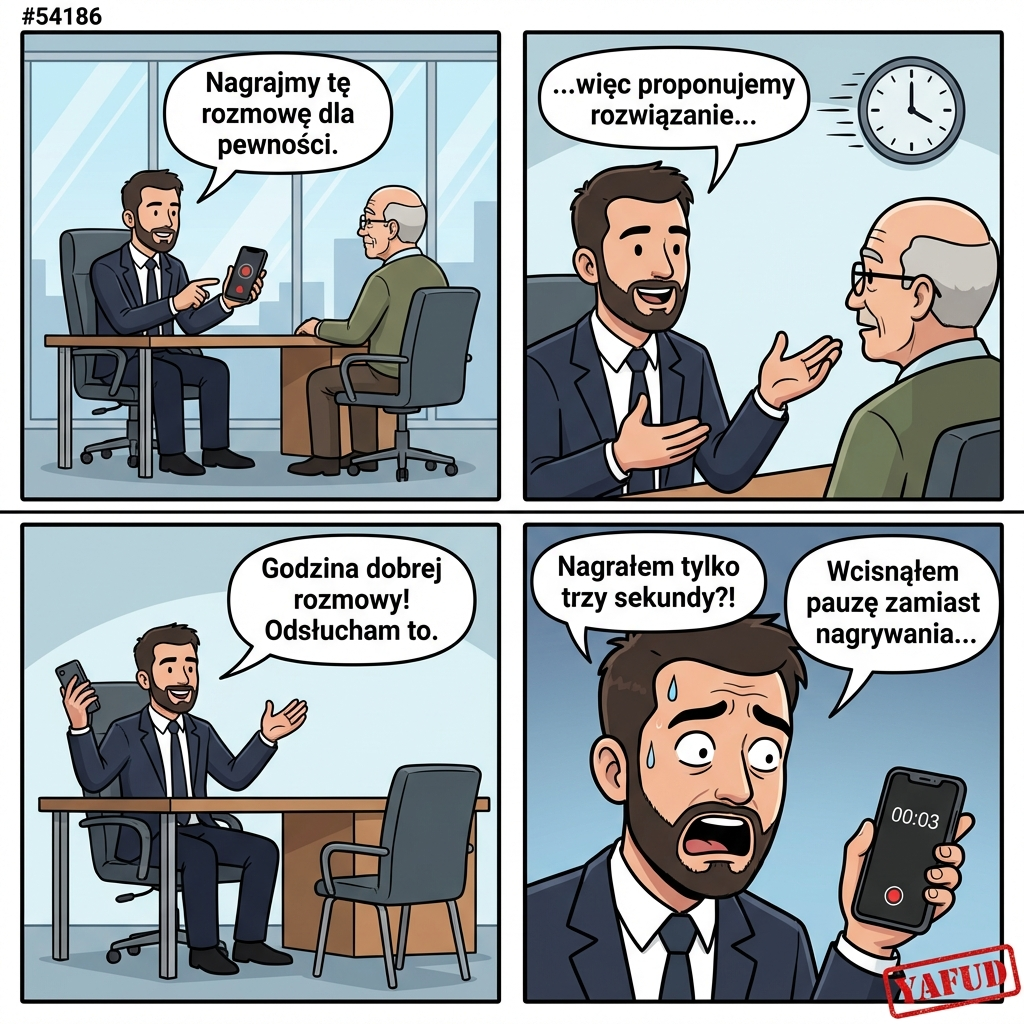 Nagrywałem ważną rozmowę z klientem na dyktafon w telefonie. Rozmowa trwała godzinę. Kiedy chciałem odsłuchać nagranie, okazało się, że przez przypadek nacisnąłem pauzę zamiast nagrywania. Nagrałem tylko pierwsze trzy sekundy. YAFUD«Poprzednia wpadkaNastępna wpadka »