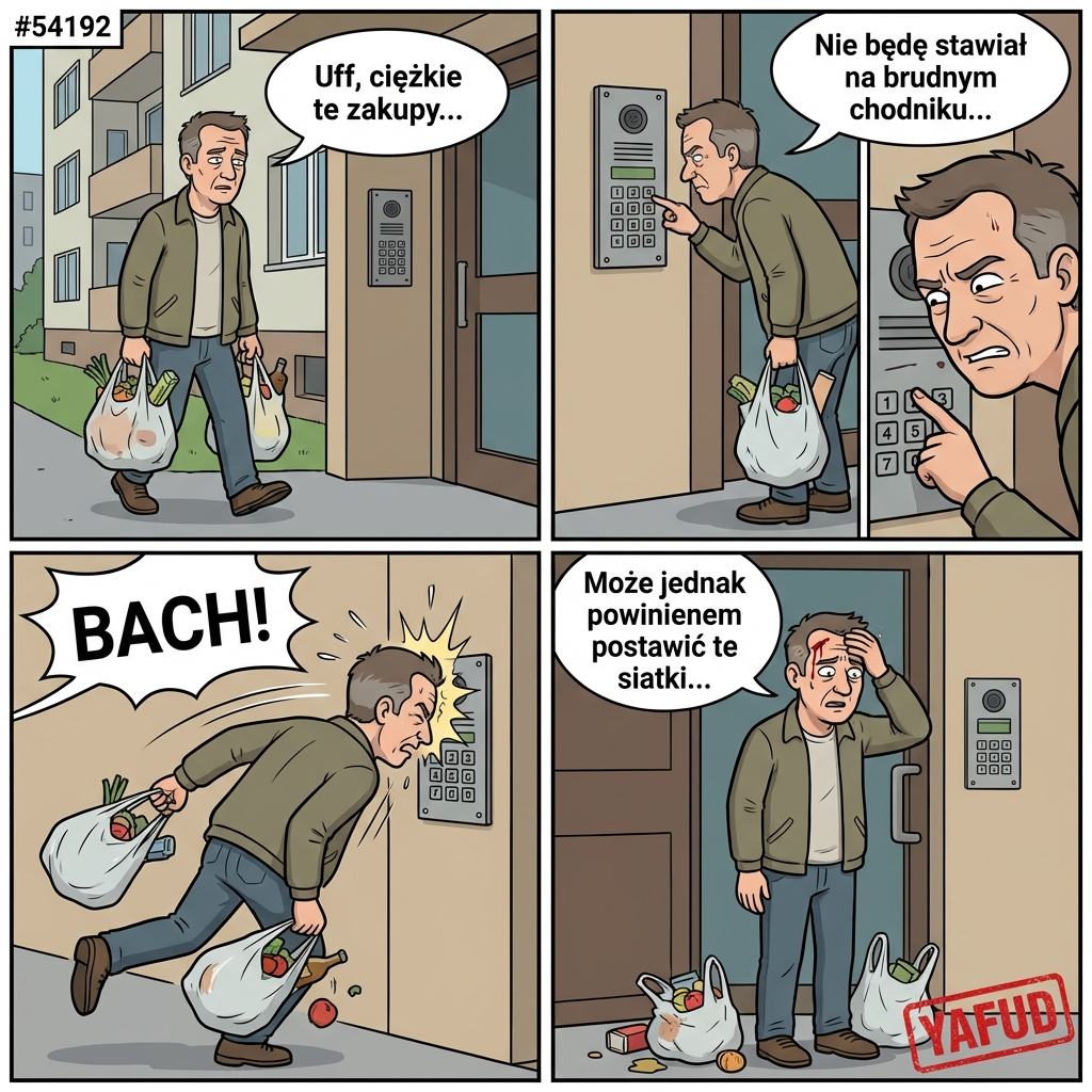 Wracałem z zakupów z dwiema ciężkimi siatkami w rękach. Pod klatką chciałem wpisać kod domofonu nosem, żeby nie stawiać siatek na brudnym chodniku. Nie trafiłem w klawisz, straciłem równowagę i uderzyłem czołem w metalowy panel domofonu, rozcinając sobie łuk brwiowy. YAFUD«Poprzednia wpadka