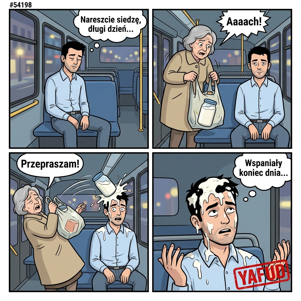 Wracałem z pracy autobusem. Usiadłem z tyłu. Na zakręcie autobus gwałtownie zahamował. Jakaś pani stojąca nade mną z zakupami straciła równowagę i upuściła siatkę. Pękł w niej jogurt naturalny, który wylał się prosto na moją głowę i spłynął za kołnierz. YAFUD«Poprzednia wpadkaNastępna wpadka »