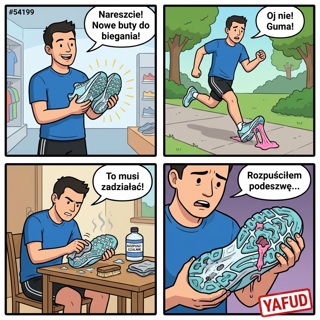 Kupiłem nowe, markowe buty do biegania. Na pierwszym treningu wdepnąłem w gumę do żucia, która wtopiła się w skomplikowany bieżnik podeszwy. Próby usunięcia jej domowymi sposobami skończyły się tym, że rozpuściłem część podeszwy rozpuszczalnikiem. YAFUD«Poprzednia wpadkaNastępna wpadka »