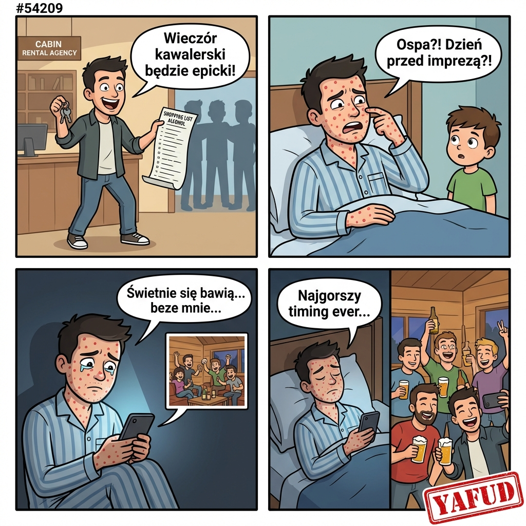 Organizowałem wieczór kawalerski dla przyjaciela. Wynająłem domek, kupiłem alkohol. W dniu imprezy dostałem ospy wietrznej, którą zaraziłem się od siostrzeńca. Mam 30 lat. Impreza się odbyła, ale beze mnie, a koledzy wysyłali mi zdjęcia, jak świetnie się bawią. YAFUD«Poprzednia wpadkaNastępna wpadka »