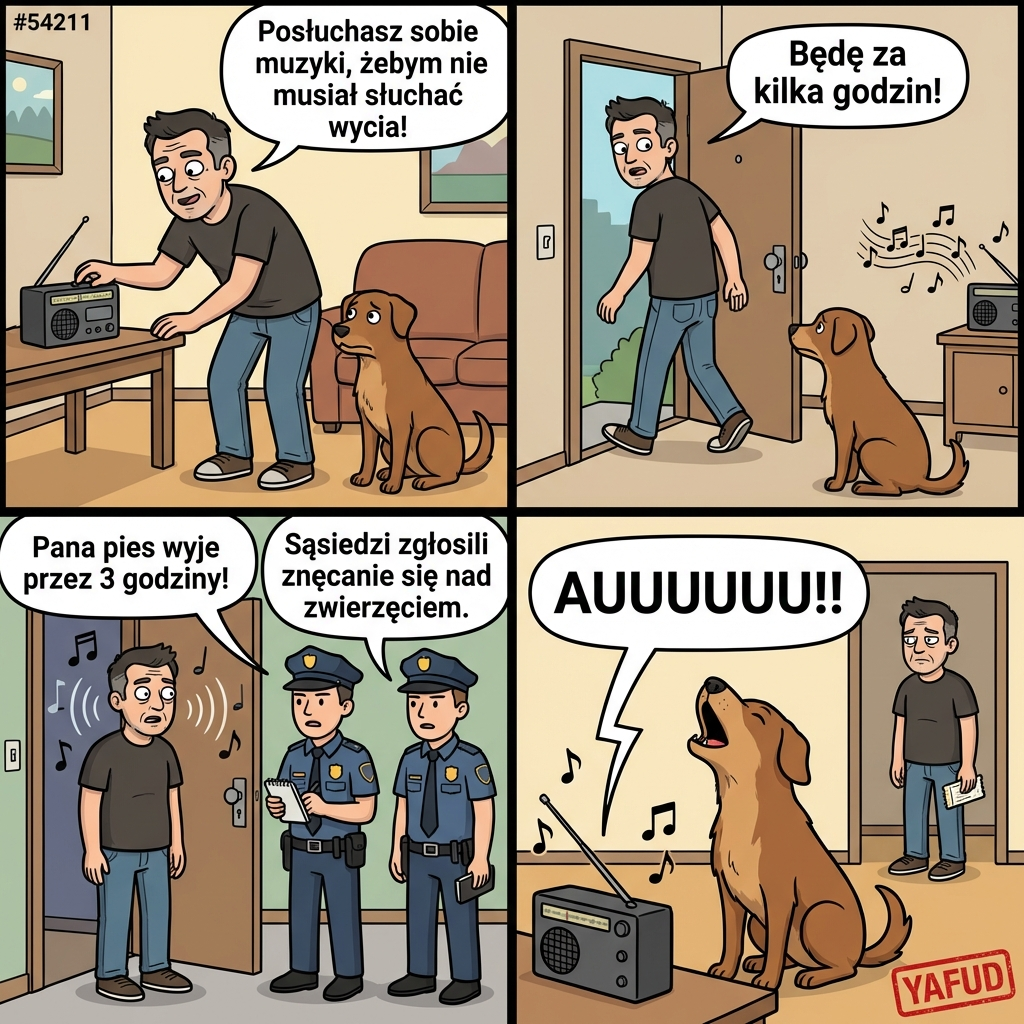 Mój pies ma lęk separacyjny, więc zostawiłem mu włączone radio, żeby nie czuł się samotny. Wróciłem do domu i zastałem policję pod drzwiami. Okazało się, że pies wył do rytmu piosenek tak głośno, że sąsiedzi zgłosili znęcanie się nad zwierzęciem. Dostałem mandat za zakłócanie spokoju. YAFUD«Poprzednia wpadka