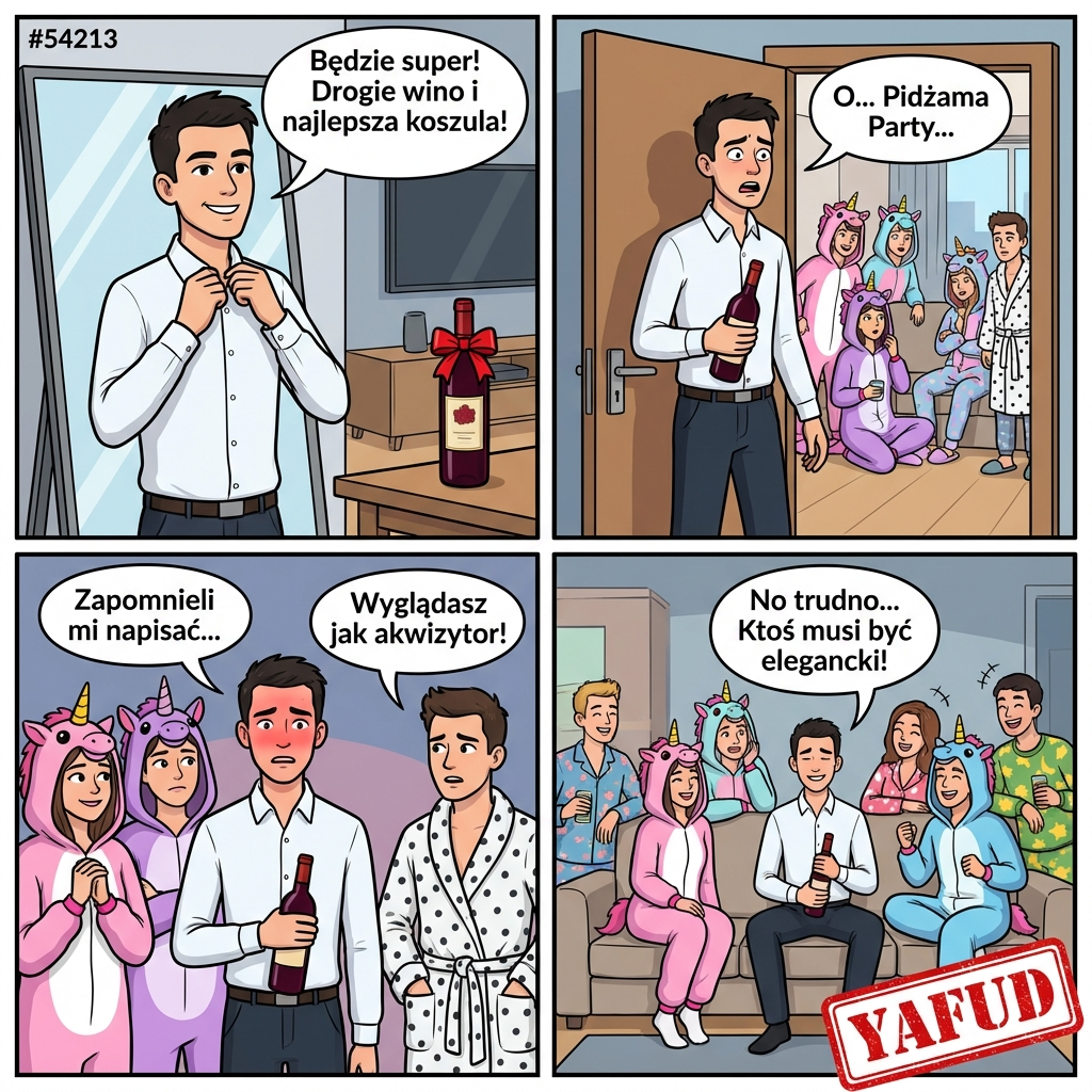 Poszedłem na domówkę do znajomych z liceum, których dawno nie widziałem. Chciałem wypaść dobrze, więc kupiłem drogie wino i założyłem najlepszą koszulę. Na wejściu okazało się, że impreza jest tematyczna – 'Pidżama Party', o czym zapomnieli mi napisać w zaproszeniu. Wszyscy siedzieli w onesie jednorożców i szlafrokach, a ja wyglądałem jak akwizytor, który pomylił drzwi. YAFUD«Poprzednia wpadkaNastępna wpadka »