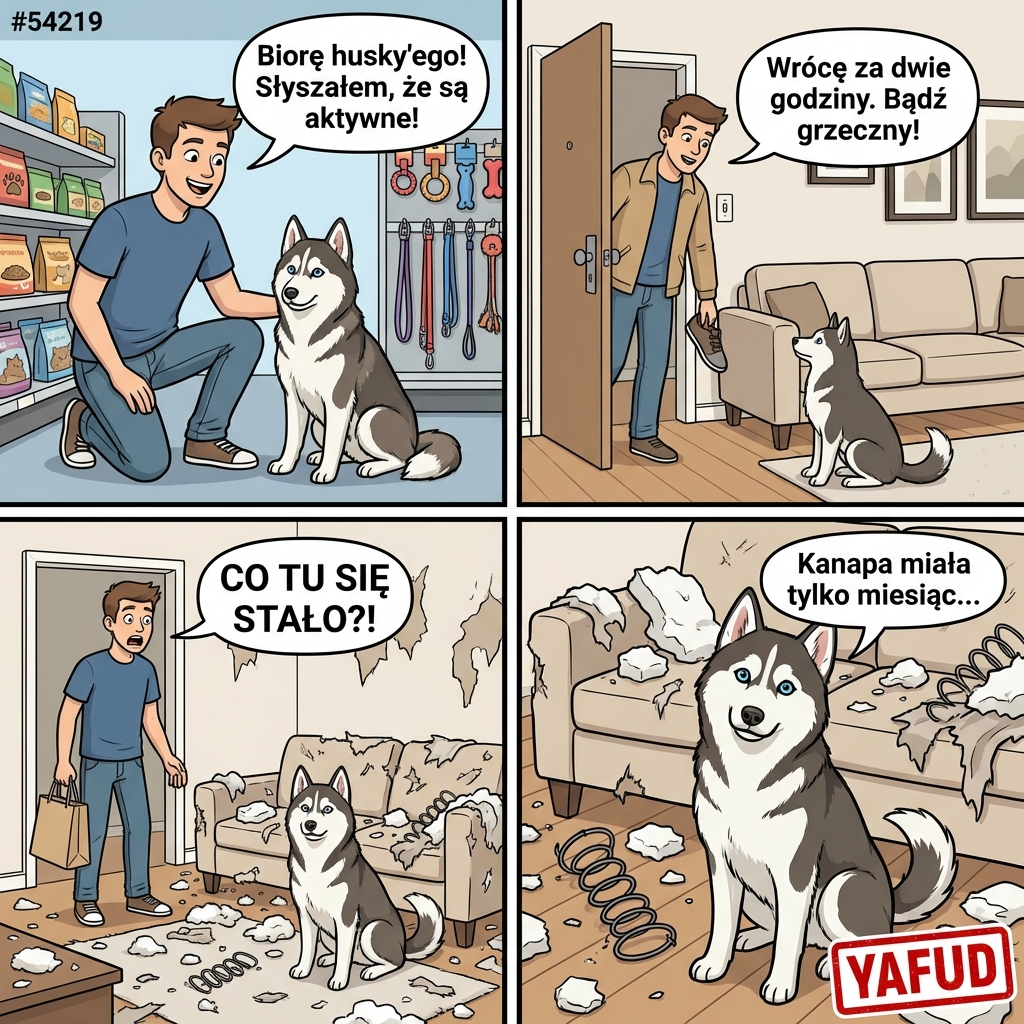 Kupiłem psa rasy husky, bo słyszałem, że są aktywne. Zostawiłem go samego w domu na dwie godziny, żeby pójść na zakupy. Po powrocie zastałem kanapę rozerwaną na strzępy. Gąbka i sprężyny były w każdym pokoju, a pies siedział na środku tego bałaganu z niewinną miną. Kanapa miała miesiąc. YAFUD«Poprzednia wpadkaNastępna wpadka »