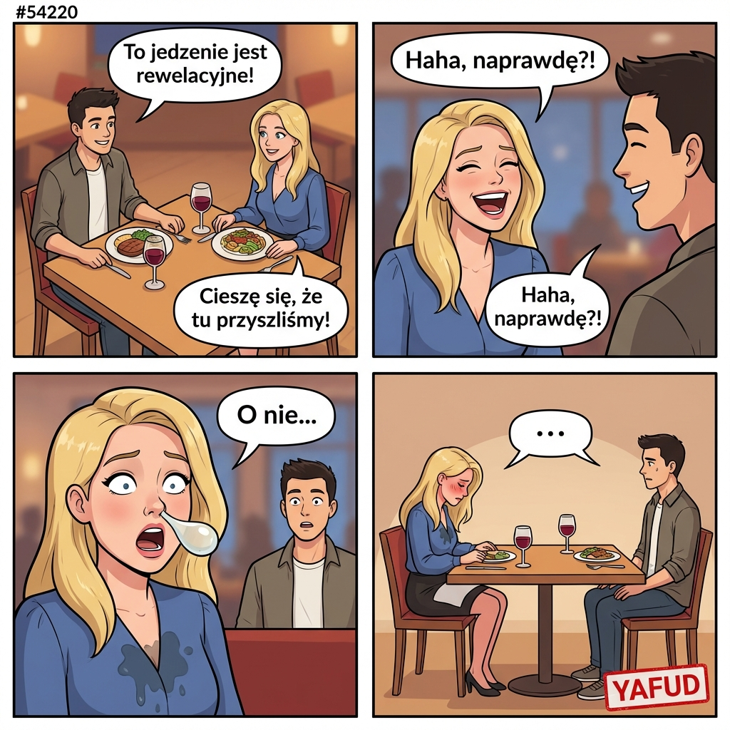 Poszedłem na pierwszą randkę z dziewczyną poznaną przez aplikację. Rozmowa kleiła się świetnie, jedzenie było pyszne, a atmosfera luźna. W pewnym momencie, gdy się śmiała, z nosa wyleciała jej wielka bańka z kataru, która pękła na jej bluzce. Resztę wieczoru spędziliśmy w krepującym milczeniu, bo ona była zbyt zawstydzona, by cokolwiek powiedzieć. YAFUD«Poprzednia wpadkaNastępna wpadka »