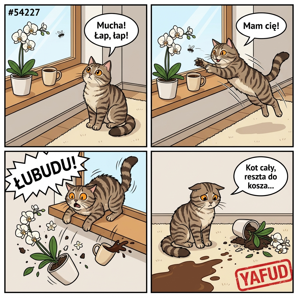 Mój kot uwielbia polować na muchy. Skoczył na parapet za jedną z nich, ale nie wyhamował. Zbił doniczkę z moim ulubionym storczykiem, a sam, przestraszony hałasem, zrzucił jeszcze stojącą obok kawę na jasny dywan. Kot cały, storczyk połamany, dywan do wymiany. YAFUD«Poprzednia wpadkaNastępna wpadka »