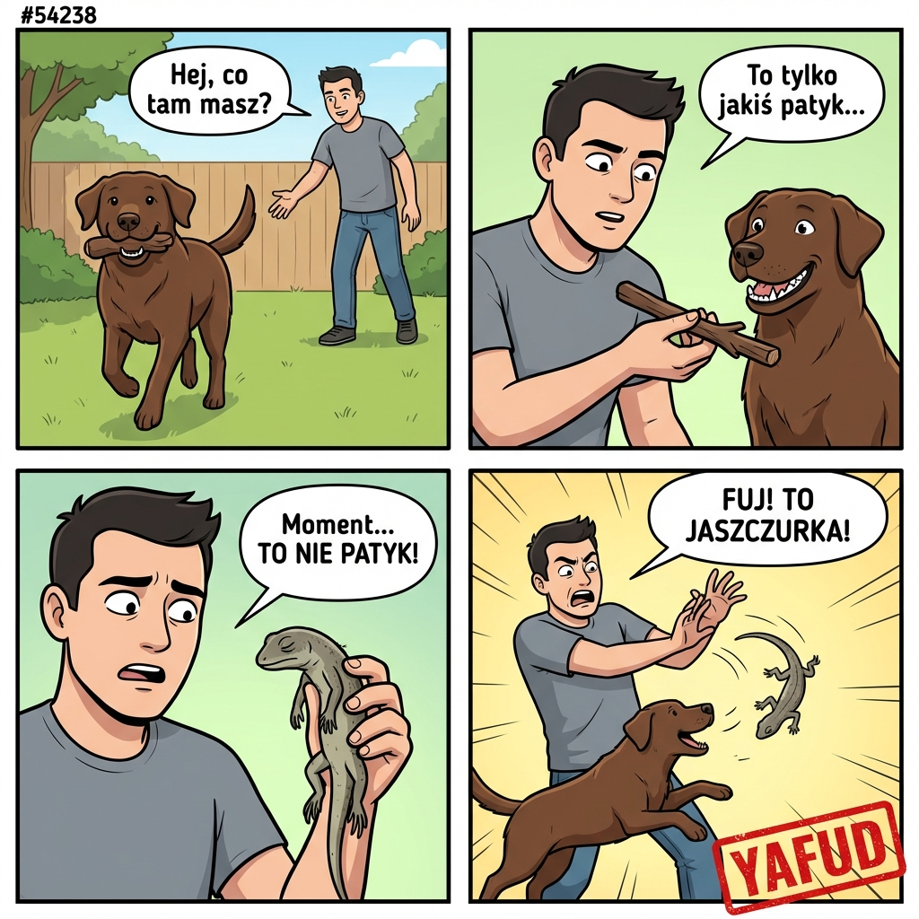 Mój pies przyniósł z ogrodu coś, co wyglądało jak patyk. Zabrałem mu to z pyska. To była martwa jaszczurka. Trzymałem ją gołą ręką przez dobrych kilka sekund zanim zorientowałem się, co to jest. YAFUD«Poprzednia wpadkaNastępna wpadka »