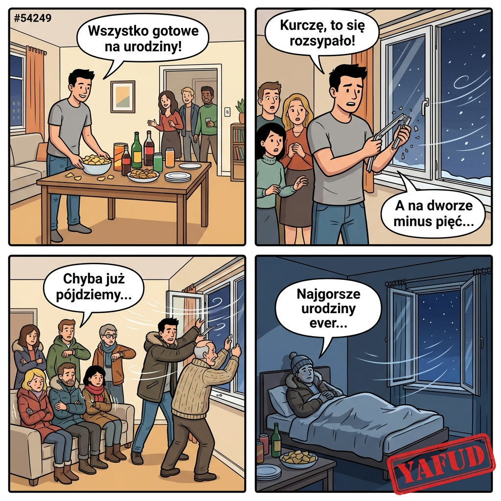 Zaprosiłem znajomych na domówkę z okazji moich urodzin. Kupiłem mnóstwo przekąsek i napojów, a mieszkanie lśniło czystością. Pierwsi goście pojawili się około dwudziestej i impreza zaczęła się rozkręcać. Postanowiłem otworzyć okno w salonie, żeby wpuścić trochę świeżego powietrza. Mechanizm okienny po prostu się rozsypał w moich rękach. Okno otworzyło się na oścież i zablokowało w tej pozycji, a zawiasy wyskoczyły z prowadnic. Na dworze było minus pięć stopni i wiał silny wiatr. Mimo prób naprawy z sąsiadem, nie daliśmy rady tego zamknąć. Goście po godzinie zaczęli się ubierać w kurtki z powodu zimna. Impreza zakończyła się przed północą, a ja spałem w czapce zimowej. YAFUD.«Poprzednia wpadkaNastępna wpadka »