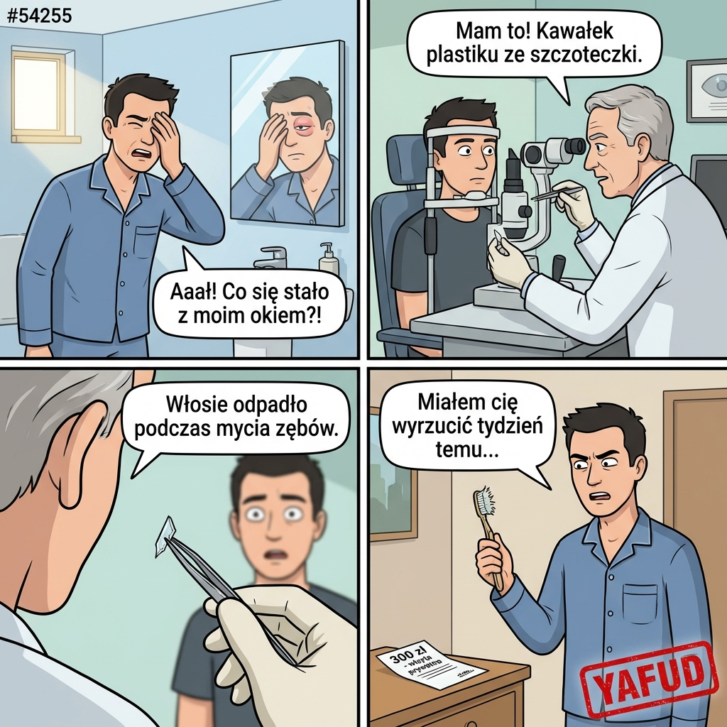 Obudziłem się rano z silnym bólem oka. Poszedłem do łazienki i zobaczyłem w lustrze, że mam spuchniętą i czerwoną powiekę. Pojechałem od razu do okulisty, bo bałem się o wzrok. Lekarz po dokładnym zbadaniu wyciągnął z mojego oka maleńki, ostry kawałek plastiku. Okazało się, że to fragment włosia z mojej własnej szczoteczki do zębów, który musiał odpaść wieczorem, gdy myłem zęby, a potem przypadkiem przetarłem oko. Zapłaciłem za prywatną wizytę trzysta złotych. Całe to zamieszanie i ból wywołała zużyta szczoteczka, którą planowałem wyrzucić w zeszłym tygodniu. YAFUD«Poprzednia wpadkaNastępna wpadka »