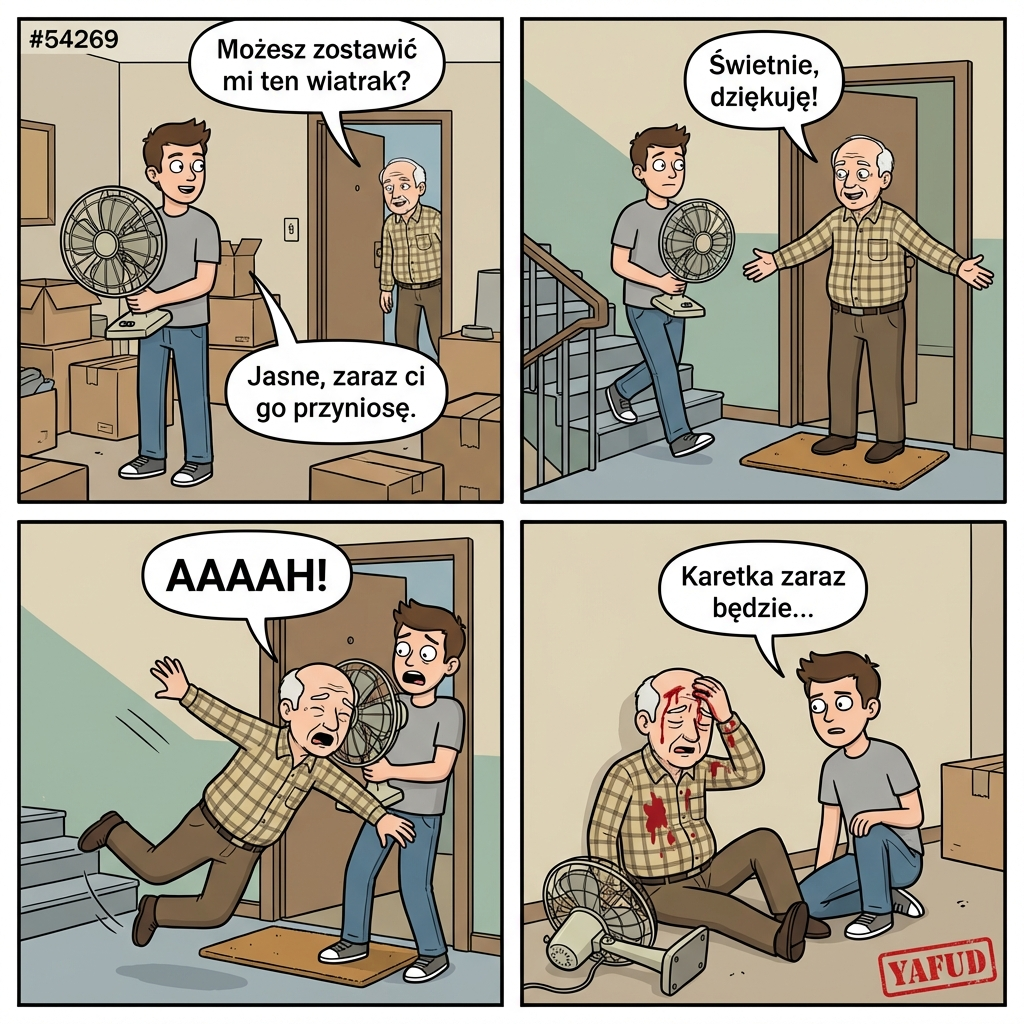 Wyprowadzałem się z wynajmowanego mieszkania i pakowałem ostatnie rzeczy. Sąsiad z dołu poprosił, żebym zostawił mu swój stary wiatrak, na co się zgodziłem. Zszedłem do niego z urządzeniem w rękach. Kiedy przekazywałem mu wiatrak w progu, on potknął się o wycieraczkę. Upadł do przodu, uderzając twarzą w metalową osłonę śmigła. Rozciął sobie czoło (naprawdę mocno), a ja zamiast się pakować, czekałem z nim na karetkę. YAFUD«Poprzednia wpadkaNastępna wpadka »