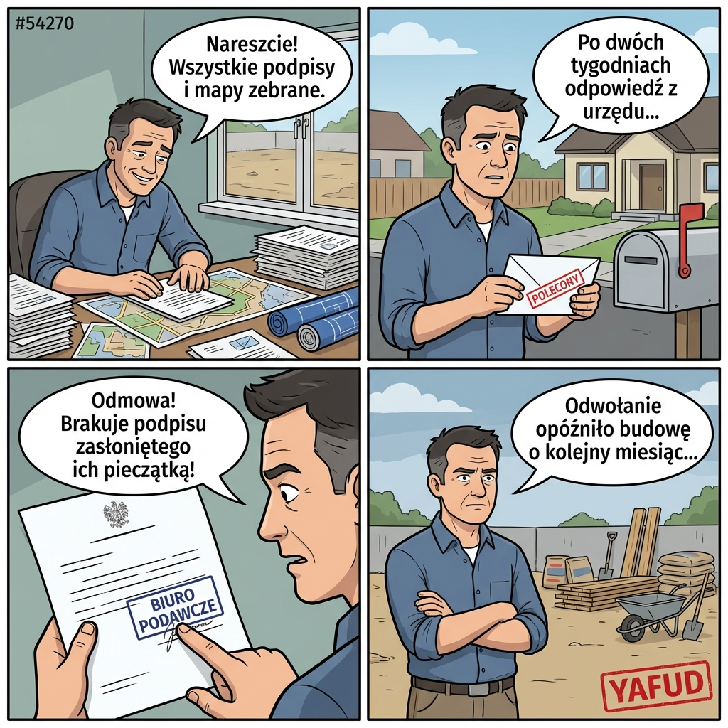 Wysłałem do urzędu wypełniony formularz dotyczący zgłoszenia budowy na działce. Spędziłem kilka dni na zbieraniu odpowiednich map i podpisów. Po dwóch tygodniach dostałem list polecony z urzędu. Decyzja była odmowna. Urzędnik powołał się na brakujący podpis w polu, które było całkowicie zasłonięte przez pieczątkę z biura podawczego. Dokument został odrzucony przez błąd ich własnego pracownika na etapie przyjmowania pisma. Złożenie odwołania wstrzymało moje prace budowlane na kolejny miesiąc. YAFUD«Poprzednia wpadkaNastępna wpadka »