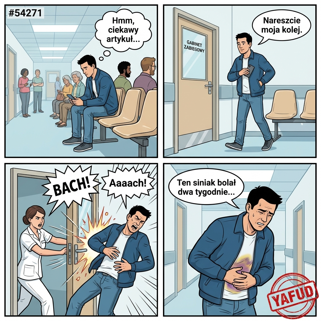Szedłem na badania krwi do przychodni wcześnie rano. Czekałem w kolejce na korytarzu, czytając artykuł na telefonie. Kiedy przyszła moja kolej, wstałem z krzesła i ruszyłem w stronę gabinetu zabiegowego. Pielęgniarka otwierając drzwi na oścież, uderzyła we mnie z całym impetem. Klamka wbiła się prosto w mój brzuch, pozbawiając mnie tchu. Badanie odbyło się normalnie, ale siniak bolał przez dwa tygodnie. YAFUD«Poprzednia wpadkaNastępna wpadka »