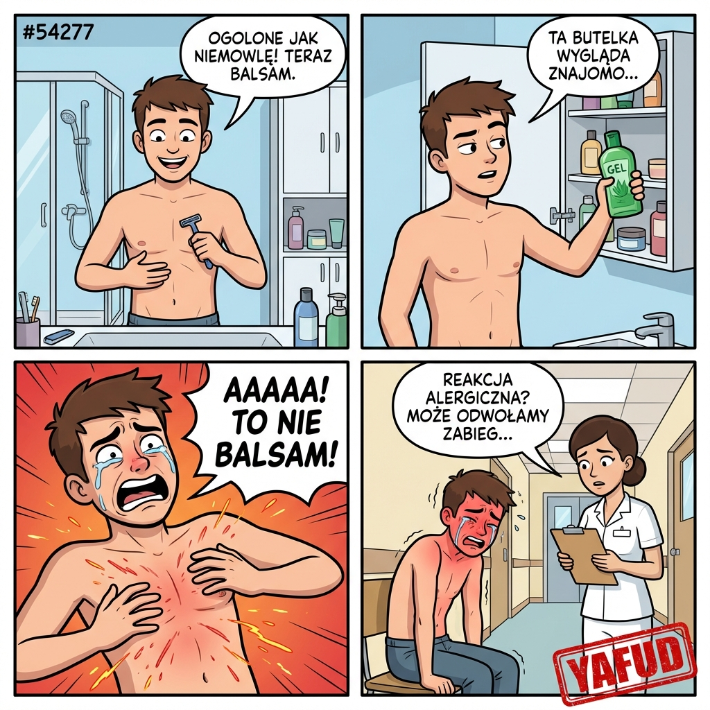 Przed wyjściem na pierwszą w życiu operację chirurgiczną miałem za zadanie ogolić klatkę piersiową i brzuch. Użyłem do tego nowej, bardzo ostrej jednorazowej maszynki. Golenie poszło gładko, a skóra wydawała się czysta. Po wyjściu spod prysznica postanowiłem zastosować łagodzący balsam, żeby uniknąć podrażnień. Sięgnąłem w szafce po butelkę w podobnym kształcie i rozprowadziłem płyn po całym ogolonym ciele. Kilka sekund później poczułem pieczenie tak intensywne, jakbym oblał się wrzątkiem. Okazało się, że zamiast balsamu użyłem miętowego żelu rozgrzewającego dla sportowców, który moja żona kupiła na bóle mięśniowe. Zawarty w nim mentol w połączeniu z mikrouszkodzeniami po goleniu wywołał prawdziwe piekło na mojej skórze. Nie mogłem zmyć tego z siebie wodą, bo reakcja tylko się nasilała. Do szpitala pojechałem ze łzami w oczach, trzęsąc się z bólu i pieczenia. Pielęgniarka na oddziale uznała, że dostałem silnej reakcji alergicznej i o mały włos nie odwołano mojego zabiegu. YAFUD«Poprzednia wpadkaNastępna wpadka »