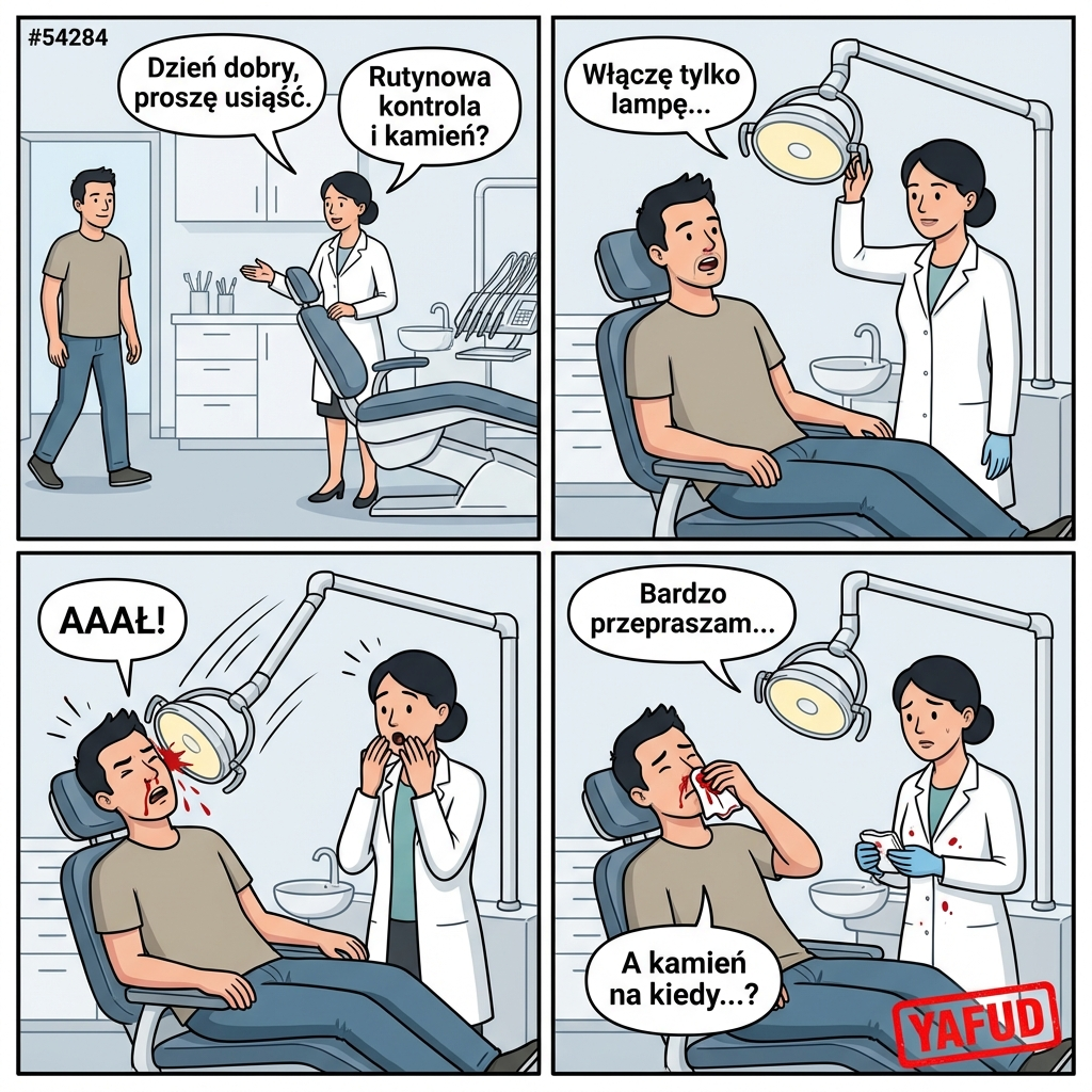 Poszedłem do dentysty na rutynową kontrolę i ściąganie kamienia. Usiadłem na fotelu, pani doktor przygotowała narzędzia. Podczas włączania lampy oświetlającej, ramię urządzenia nagle opadło. Żarówka uderzyła mnie prosto w nos, powodując obfity krwotok. Wizyta skończyła się na tamowaniu krwi. YAFUD«Poprzednia wpadkaNastępna wpadka »