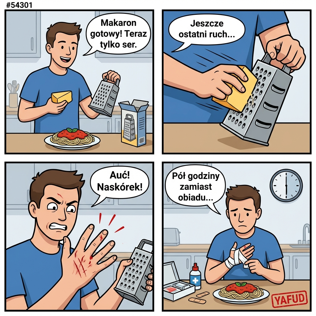 Ugotowałem na obiad makaron z sosem pomidorowym. Chciałem zetrzeć na wierzch twardy ser dojrzewający. Użyłem ostrej tarki, którą niedawno kupiłem. Przy ostatnim ruchu dłoń mi się omsknęła i zamiast sera, solidnie starłem sobie naskórek z knykci. Zamiast spokojnego posiłku, musiałem spędzić pół godziny na dezynfekcji i zakładaniu plastrów. YAFUD«Poprzednia wpadkaNastępna wpadka »