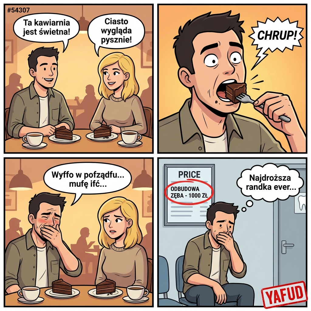 Zaprosiłem dziewczynę z pracy na kawę po godzinach. Siedzieliśmy w kawiarni i bardzo dobrze nam się rozmawiało. Zamówiłem nam po kawałku ciasta czekoladowego. Jadłem bardzo kulturalnie, używając widelczyka. Nagle, podczas odgryzania kawałka, poczułem chrupnięcie. W cieście znajdował się mały, twardy kawałek łupiny orzecha. Złamałem sobie na nim przedniego zęba. Resztę randki spędziłem z dłonią przy ustach, sepleniąc i próbując ukryć ubytek. Dziewczyna uznała moje zachowanie za dziwne i szybko zakończyła spotkanie. Ząb musiałem odbudować u protetyka, co kosztowało mnie tysiąc złotych. YAFUD«Poprzednia wpadkaNastępna wpadka »