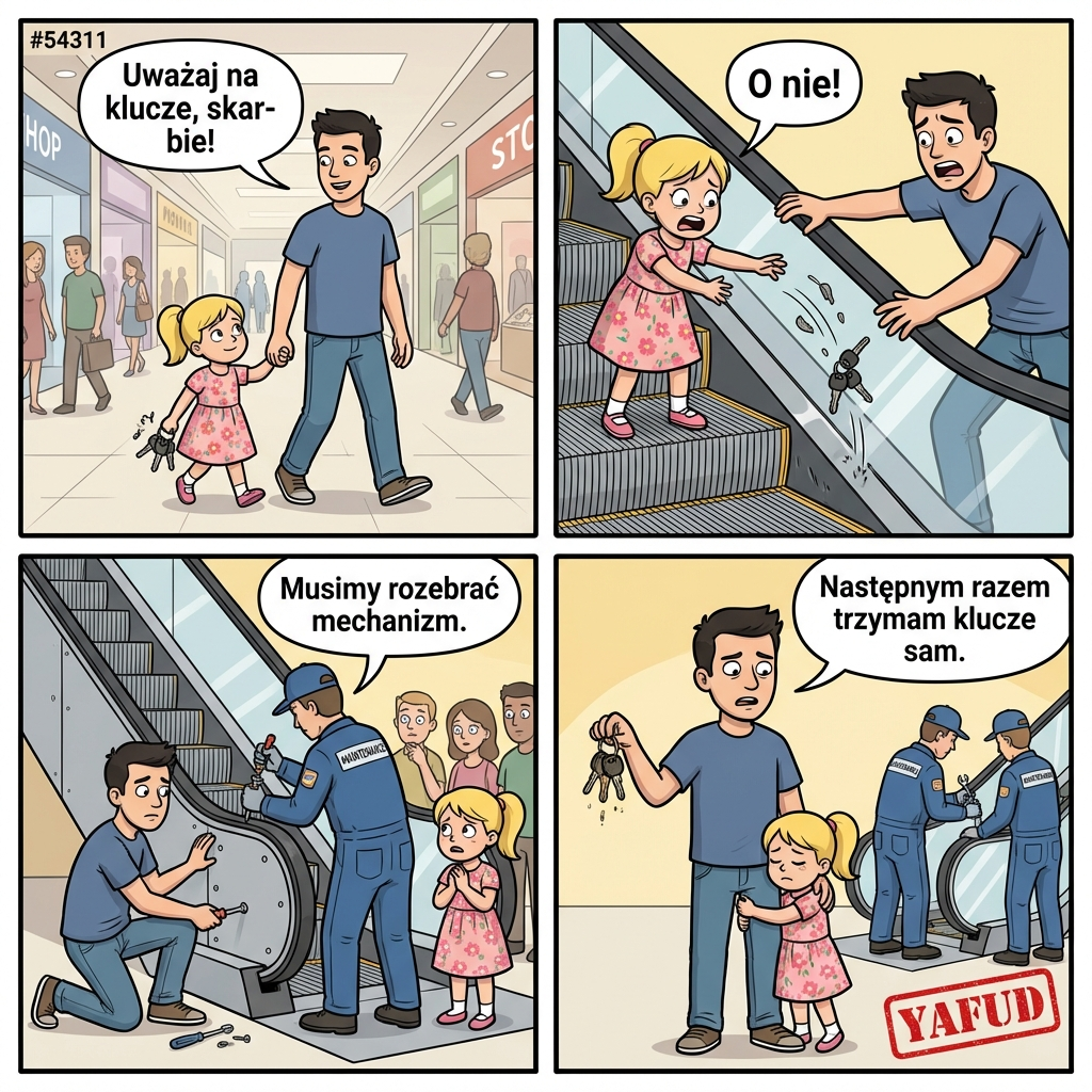 Zabrałem córkę na zakupy do centrum handlowego. Pozwoliłem jej trzymać moje kluczyki do samochodu. Przy ruchomych schodach mała upuściła klucze. Metalowy pęk wpadł w szczelinę z boku schodów i zniknął w mechanizmie. Musiałem wzywać techników, którzy wyłączyli schody i rozkręcili obudowę. Kosztowało mnie to sporo czekania. YAFUD«Poprzednia wpadkaNastępna wpadka »