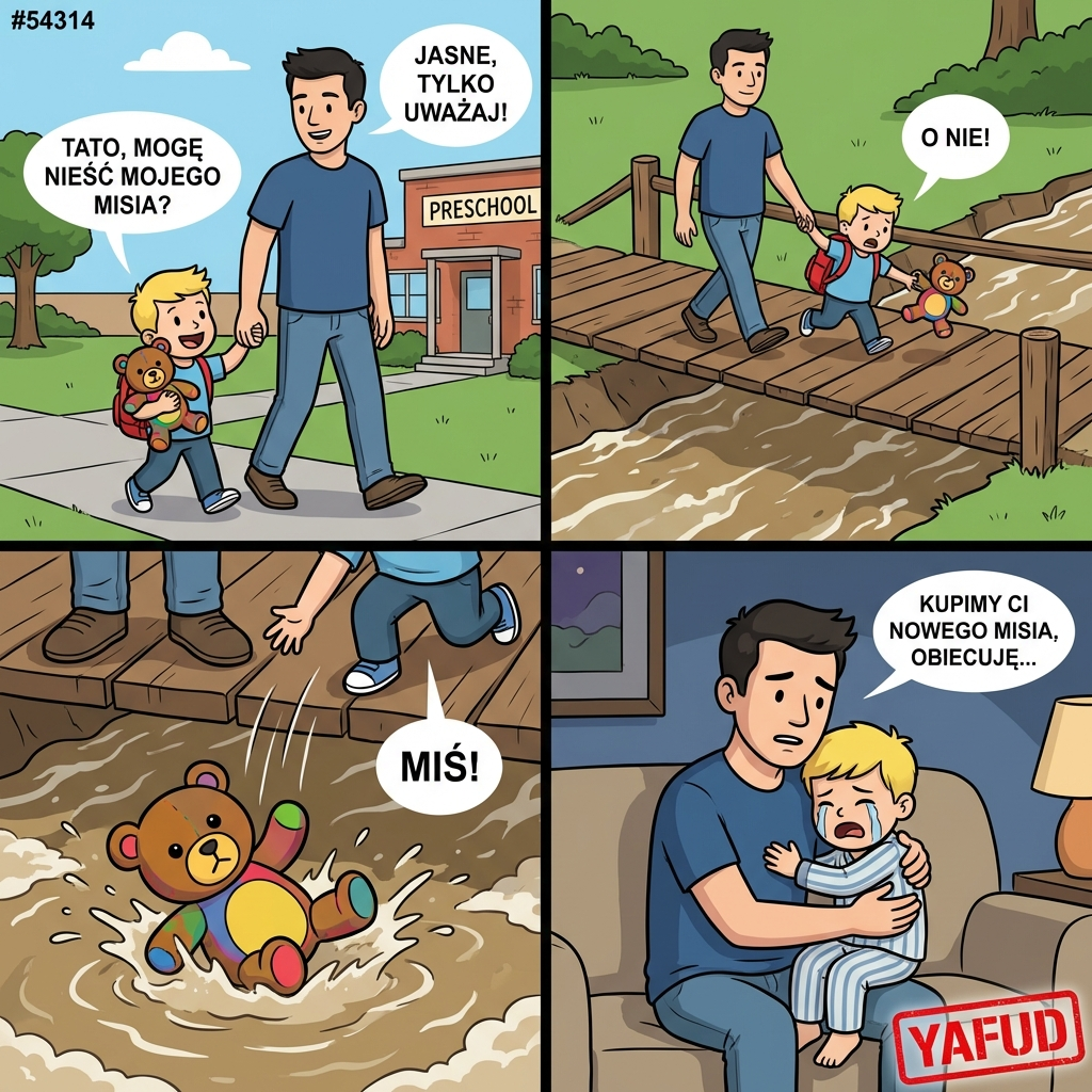 Odebrałem syna z przedszkola po zakończonych zajęciach. W drodze powrotnej pozwoliłem mu nieść w rękach jego ulubioną zabawkę. Przy przechodzeniu przez drewniany mostek upuścił ją prosto do płynącej rzeki. Zabawka natychmiast zatonęła w mętnym, szybkim nurcie. Cały wieczór spędziliśmy na próbach uspokojenia płaczącego i zrozpaczonego dziecka. YAFUD«Poprzednia wpadkaNastępna wpadka »