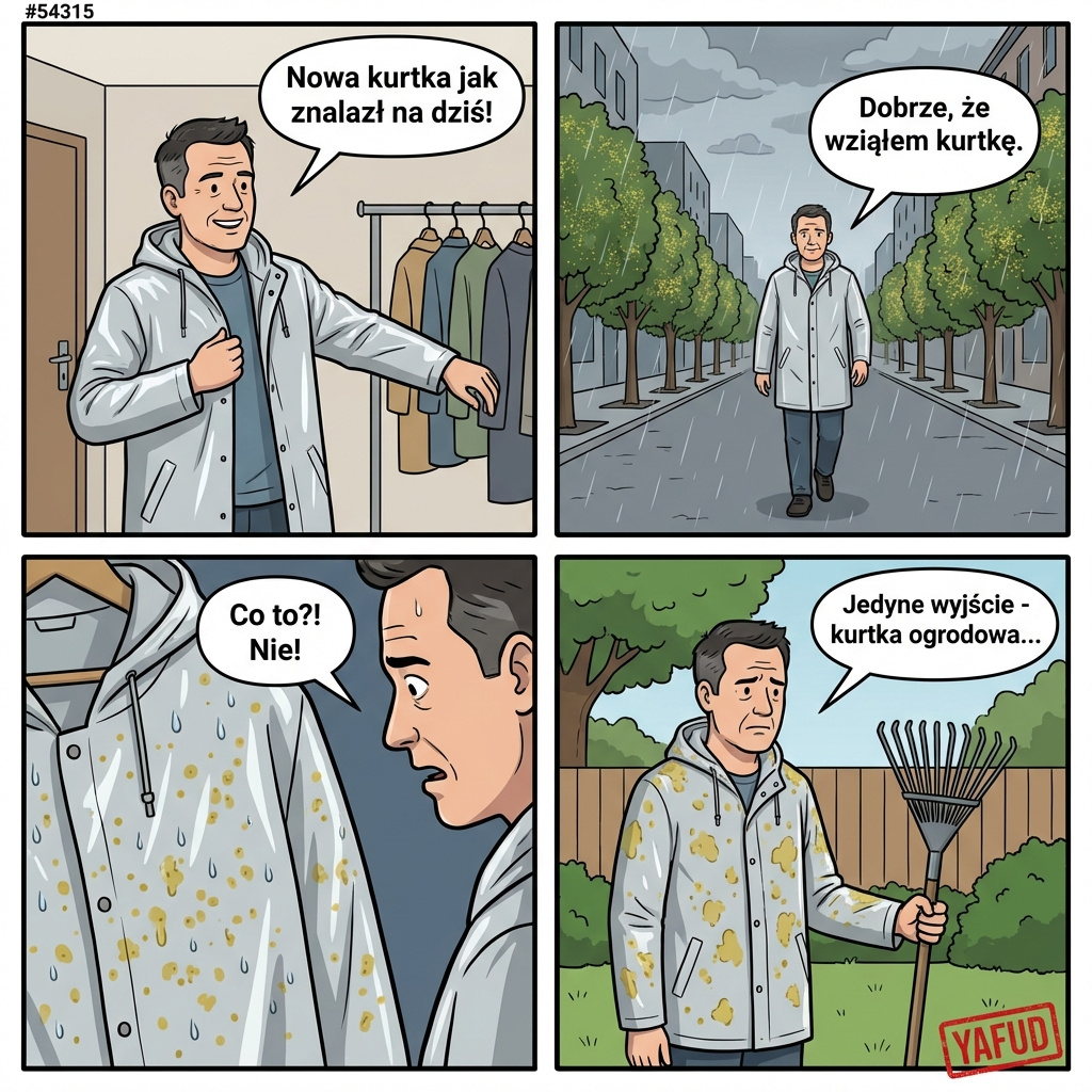 Założyłem nową, jasną kurtkę przeciwdeszczową na wyjście do centrum miasta. Pogoda była pochmurna i zaczął padać drobny deszcz. Krople deszczu zmieszały się z osadem z pyłków drzew rosnących gęsto przy ulicy. Na mojej odzieży powstały setki żółtych, tłustych plamek, które od razu wniknęły w materiał. Kurtka po zaledwie jednym założeniu nadaje się już wyłącznie do pracy w ogrodzie. YAFUD«Poprzednia wpadkaNastępna wpadka »