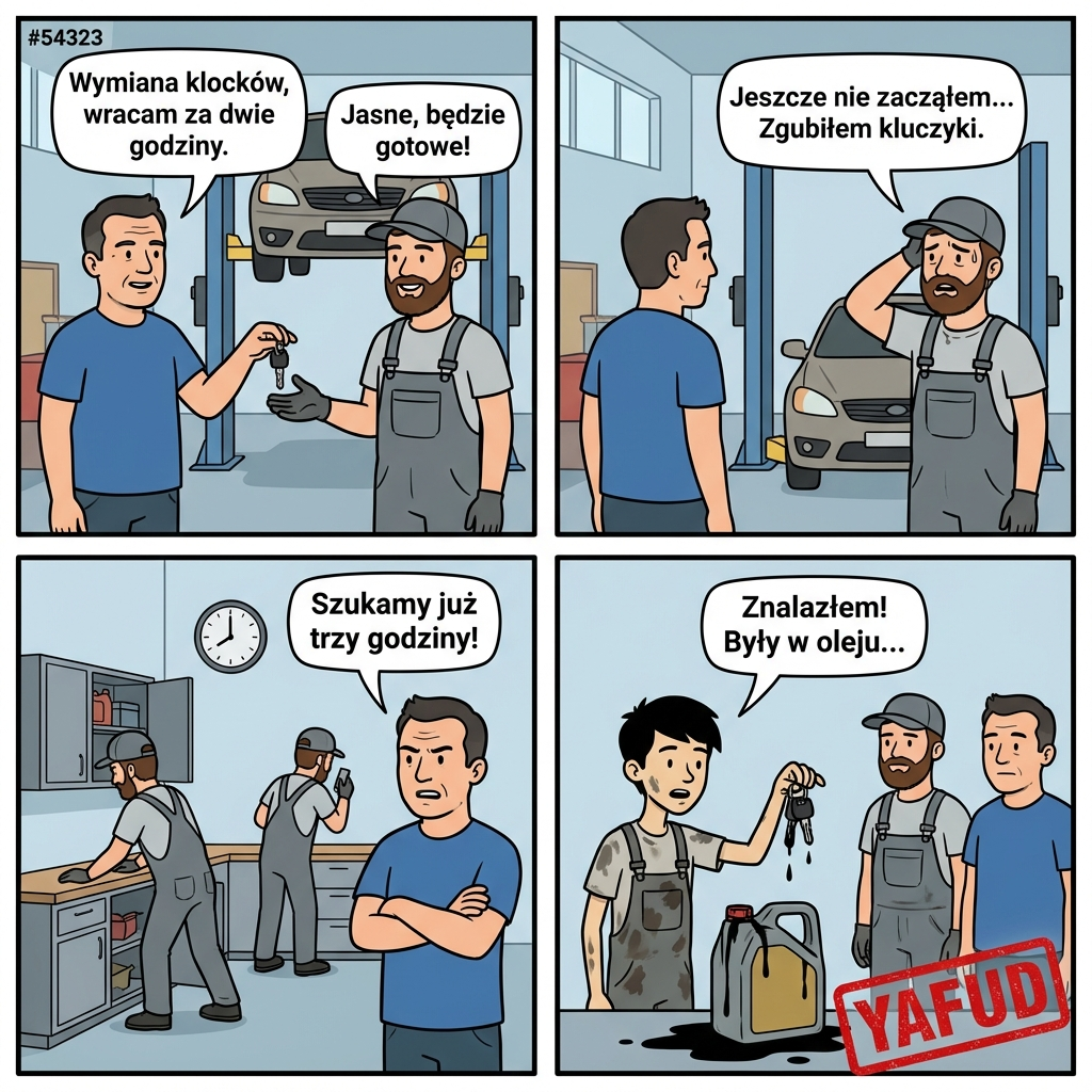 Pojechałem do mechanika na rutynową wymianę klocków hamulcowych. Umówiłem się na konkretną godzinę, żeby załatwić to szybko. Zostawiłem samochód i poszedłem na kawę do pobliskiego baru. Wróciłem po dwóch godzinach, zgodnie z ustaleniami z warsztatem. Mechanik powiedział, że jeszcze nie zaczął pracy, bo zgubił kluczyki do mojego auta. Szukali ich po całym zakładzie przez kolejne trzy godziny. Okazało się, że uczeń rzucił je do pojemnika ze zużytym olejem. YAFUD«Poprzednia wpadka