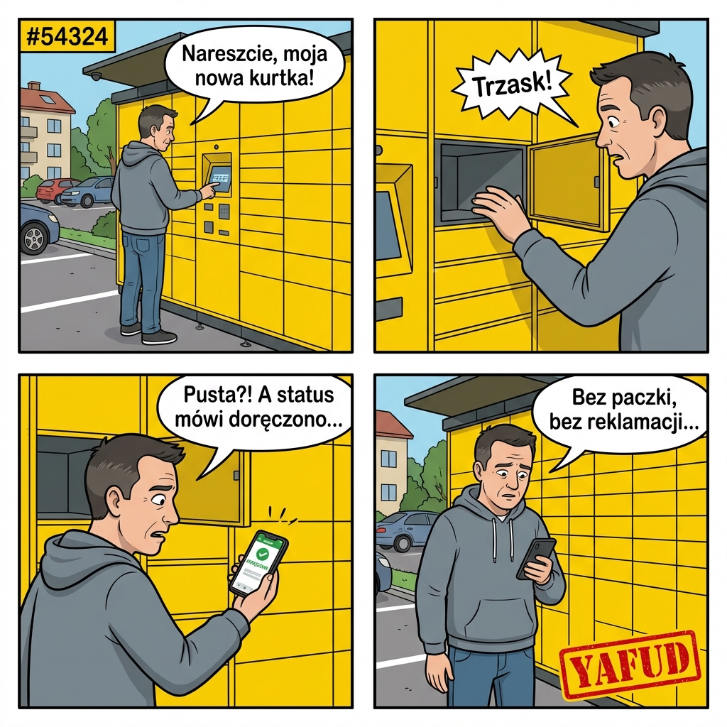 Poszedłem do paczkomatu odebrać nową kurtkę zamówioną w internecie. Wpisałem kod odbioru na ekranie maszyny. Drzwiczki odpowiedniej skrytki odskoczyły z cichym trzaskiem. Kiedy włożyłem tam rękę, okazało się, że skrytka jest całkowicie pusta. Kurier musiał włożyć paczkę do innej przegrody i zamknąć system. Zostałem przed automatem bez towaru i z fałszywym statusem 'doręczono'. Status w aplikacji zablokował mi możliwość złożenia szybkiej reklamacji. YAFUD«Poprzednia wpadkaNastępna wpadka »