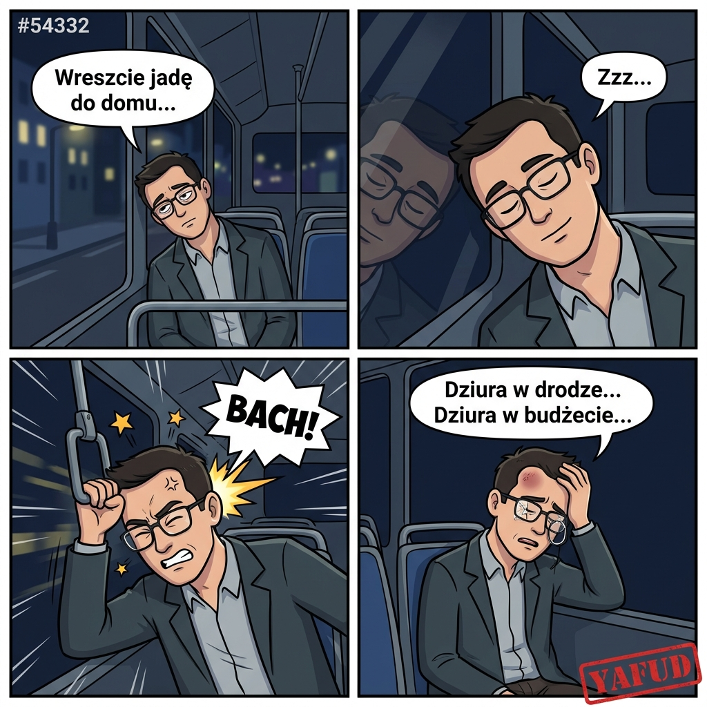 Wracałem nocnym autobusem z pracy, opierając głowę o szybę. Byłem bardzo zmęczony i przysnąłem na kilka minut przed swoim przystankiem. Autobus podskoczył na dużej wyrwie w asfalcie. Moja głowa z impetem uderzyła w uchwyt przy oknie, powodując ogromnego guza na skroni i pęknięcie oprawek moich okularów. YAFUD«Poprzednia wpadkaNastępna wpadka »