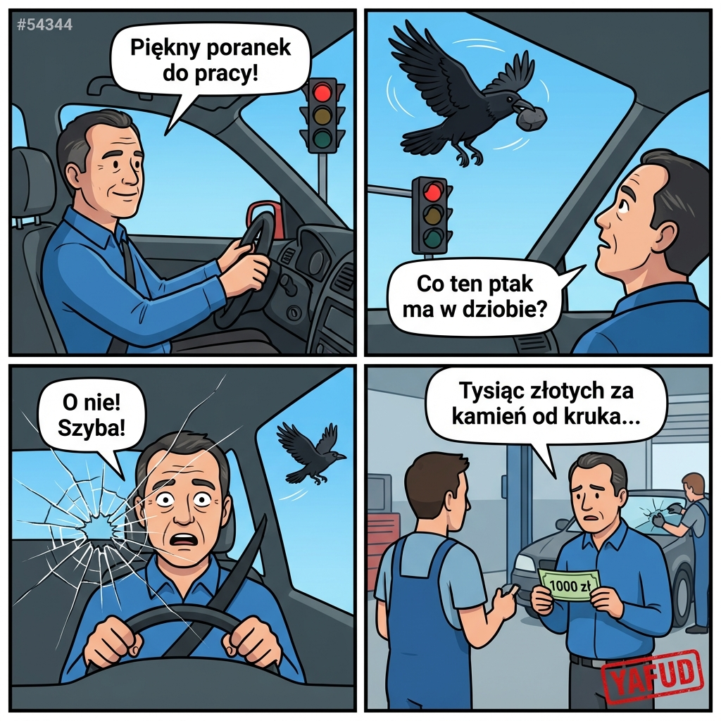 Jadąc rano do pracy, zatrzymałem się na czerwonym świetle na dużym skrzyżowaniu. Pogoda była piękna, a ja słuchałem ulubionej stacji radiowej. Kątem oka zauważyłem dużego kruka, który krążył nad sygnalizacją świetlną. Ptak miał w dziobie sporych rozmiarów kamień, który prawdopodobnie wziął za orzech. W pewnym momencie kruk wypuścił ten kamień prosto na moją przednią szybę. Uderzenie było tak niefortunne, że szyba natychmiast pękła, tworząc gęstą pajęczynę pęknięć na wysokości moich oczu. Zamiast do biura, musiałem powoli i ostrożnie pojechać prosto do warsztatu samochodowego. Wymiana szyby kosztowała mnie tysiąc złotych i całkowicie zrujnowała mój miesięczny budżet. Ubezpieczyciel uznał to za zdarzenie losowe, którego moja podstawowa polisa nie obejmuje. YAFUD«Poprzednia wpadkaNastępna wpadka »