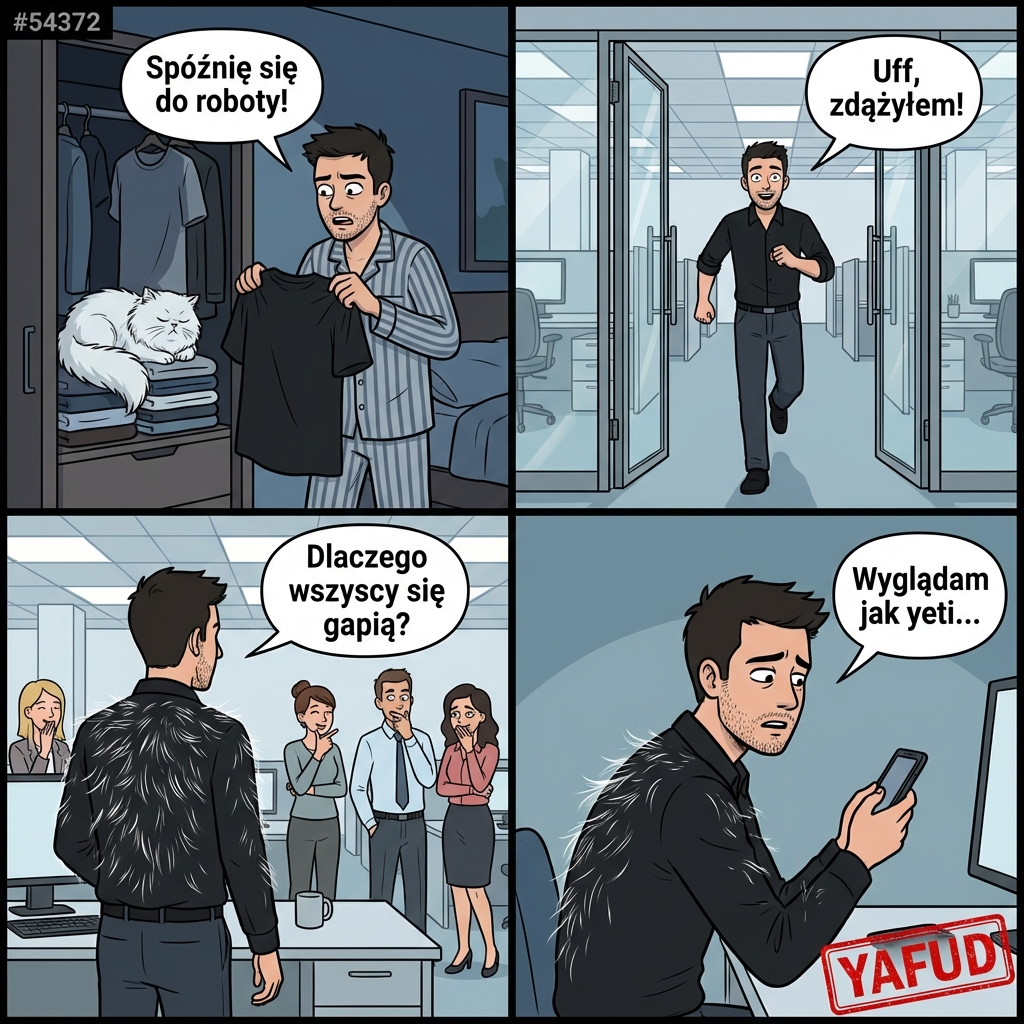 Mój kot ma zwyczaj spania na moich czystych ubraniach. Rano w pośpiechu wyciągnąłem z szafy czarną koszulę i ubrałem ją bez patrzenia w lustro. W biurze włączyłem światło i zauważyłem, że całe moje plecy są pokryte gęstą warstwą białej, długiej sierści. Nie miałem ze sobą rolki do ubrań i przez cały dzień czułem się jak yeti. YAFUD«Poprzednia wpadkaNastępna wpadka »