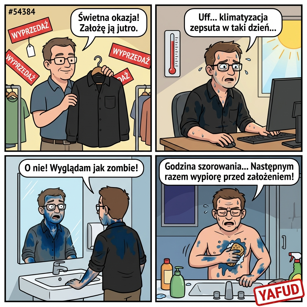 Kupiłem nową, lnianą koszulę w głębokim, czarnym kolorze na wyprzedaży. Założyłem ją następnego dnia do pracy, nie piorąc jej wcześniej. Dzień był wyjątkowo upalny, a klimatyzacja w biurze uległa awarii. Po kilku godzinach pracy przy biurku mocno się spociłem. Poszedłem do łazienki umyć ręce i spojrzałem w lustro nad umywalką. Barwnik z koszuli całkowicie zafarbował moją skórę pod spodem. Moja szyja, klatka piersiowa i ramiona przybrały intensywnie niebiesko-czarny odcień. Wyglądałem, jakbym chorował na rzadką chorobę skóry. Po powrocie do domu musiałem szorować ciało ostrą gąbką przez dobrą godzinę. YAFUD.«Poprzednia wpadkaNastępna wpadka »