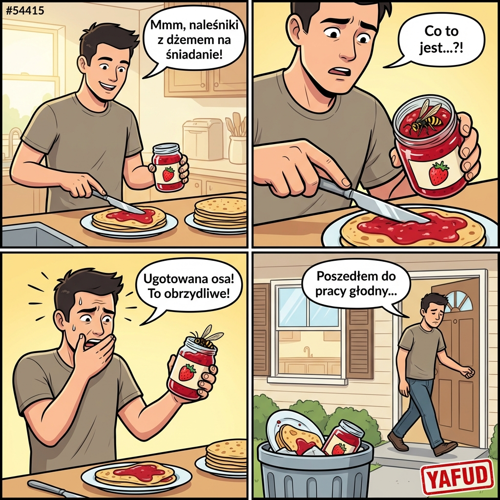 Robiłem naleśniki z dżemem na śniadanie. Otworzyłem nowy słoik dżemu truskawkowego i zacząłem smarować ciasto. Przy drugim naleśniku zauważyłem w dżemie coś czarnego. Była to martwa, ugotowana osa. Natychmiast straciłem apetyt! Wyrzuciłem całe śniadanie do kosza i poszedłem do pracy głodny. YAFUD«Poprzednia wpadkaNastępna wpadka »