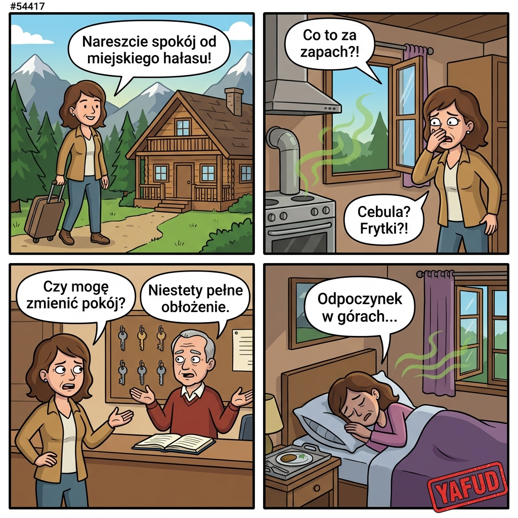 Zarezerwowałam nocleg w małym pensjonacie w górach, żeby trochę odpocząć od hałasu. Po przyjeździe na miejsce dostałam klucze do pokoju. Szybko okazało się, że moje okno znajduje się dokładnie nad wyrzutnią z kuchennego okapu. Przez cały pobyt w moim pokoju unosił się intensywny zapach smażonej cebuli i frytek. Właściciel odmówił mi zmiany pokoju, tłumacząc to pełnym obłożeniem. YAFUD«Poprzednia wpadkaNastępna wpadka »