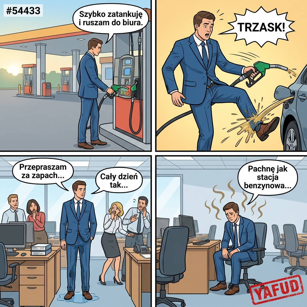 Tankowałem rano samochód w drodze do mojego biura. Dystrybutor na tej konkretnej stacji miał uszkodzoną blokadę przepływu. Kiedy pistolet w końcu odskoczył, resztka benzyny trysnęła z bardzo dużą siłą na zewnątrz. Oblany został cały mój lewy but i nogawka wyprasowanych spodni. Przez całą zmianę w pracy pachniałem jak dystrybutor paliw. YAFUD«Poprzednia wpadkaNastępna wpadka »