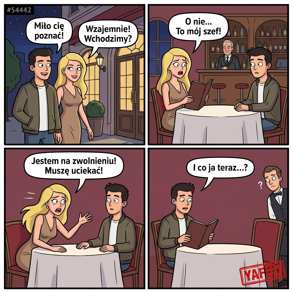 Umówiłem się na randkę w ciemno z dziewczyną, którą poleciła mi koleżanka. Spotkaliśmy się pod restauracją. Dziewczyna była bardzo atrakcyjna i rozmowna. Kiedy weszliśmy do środka i usiedliśmy przy stoliku, zauważyła przy barze swojego szefa. Zamiast się przywitać, powiedziała, że jest na zwolnieniu lekarskim i nie może być tu widziana, po czym wybiegła z restauracji, zostawiając mnie samego z kartą menu w ręku. YAFUD«Poprzednia wpadkaNastępna wpadka »