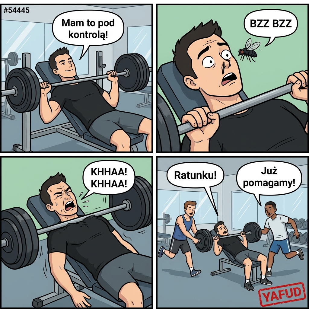 Ćwiczyłem wyciskanie na ławce płaskiej na lokalnej, osiedlowej siłowni bez asekuracji. Miałem na sztandze spory ciężar, ale czułem się pewnie, bo robiłem to wiele razy. Kiedy opuszczałem sztangę do samej klatki piersiowej, do mojego otwartego nosa wleciała duża, czarna mucha. Z powodu nagłego wciągnięcia owada do gardła zacząłem gwałtownie kasłać i natychmiast straciłem napięcie mięśniowe w ramionach. Sztanga boleśnie przygniotła mnie do ławki, a inni ćwiczący musieli biec mi na ratunek, żeby zdjąć ze mnie ciężar. YAFUD.«Poprzednia wpadkaNastępna wpadka »