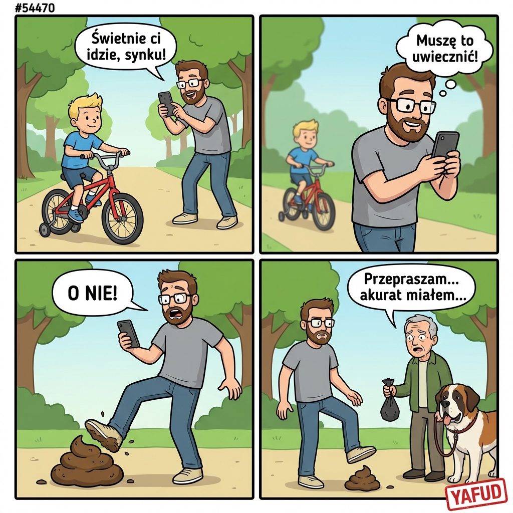 Uczyłem mojego syna jeździć na rowerze bez bocznych kółek w parku. Szło mu wspaniale i jechał prosto przed siebie na pustej alejce. Ja z dumą robiłem mu zdjęcia telefonem i przestałem patrzeć pod nogi. Wszedłem prosto w ogromną, świeżą kupę po bernardynie, brudząc nowe buty po same kostki. Obok stał zszokowany właściciel z torebką na odchody gotową do użycia. YAFUD«Poprzednia wpadkaNastępna wpadka »
