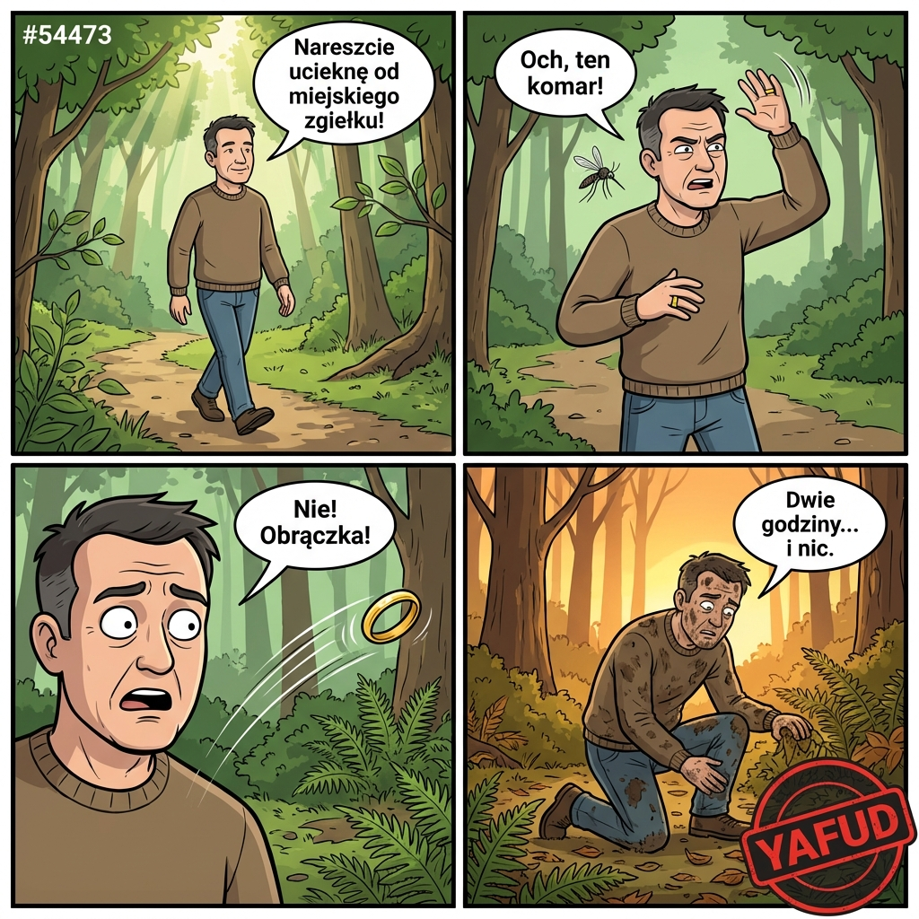 Wybrałem się na długi spacer po lesie, żeby odpocząć od miasta. Na ścieżce zaatakował mnie wyjątkowo natrętny komar, więc próbowałem go odgonić ruchem ręki. W trakcie machania, z mojego palca zsunęła się złota obrączka ślubna i wpadła prosto w głębokie poszycie leśne. Szukałem jej dwie godziny bez skutku. YAFUD«Poprzednia wpadkaNastępna wpadka »