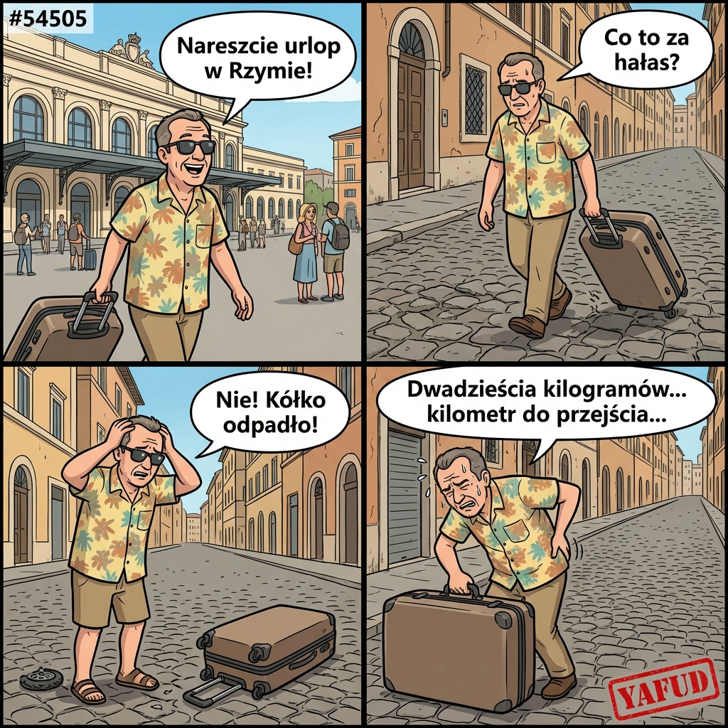 Przyleciałem do Rzymu na wyczekiwany urlop. Wychodząc z dworca, skierowałem się w stronę hotelu. Ulica była wyłożona starą, nierówną kostką brukową. Po przejściu zaledwie dziesięciu metrów kółko w mojej walizce całkowicie odpadło. Musiałem nieść dwudziestokilogramowy bagaż w rękach przez ponad kilometr. Moje wakacje zaczęły się od silnego bólu pleców. YAFUD«Poprzednia wpadkaNastępna wpadka »